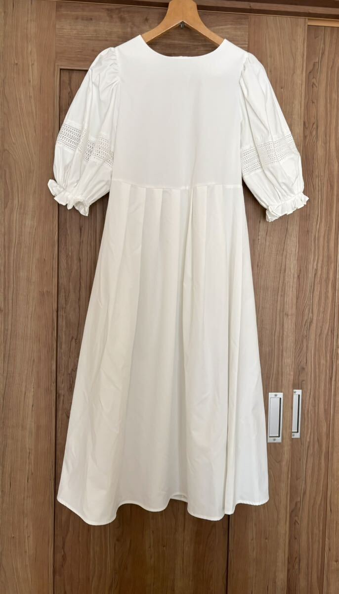 胸下のにタックを入れることで体のラインが出ないシルエットにこだわりました。