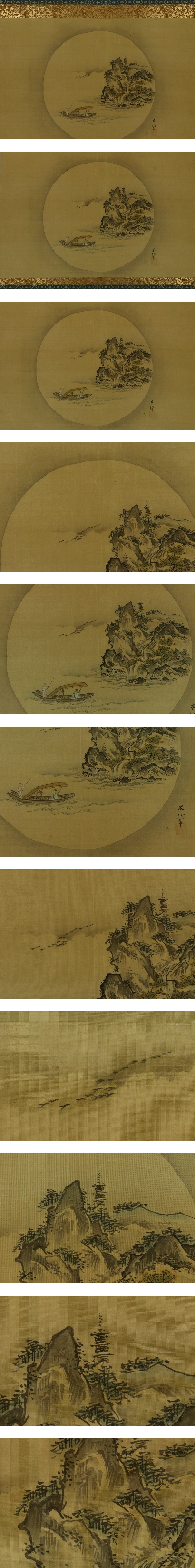 狩野岑信 かのう-みねのぶ(1662-1709) 江戸前期の狩野派の画家。 浜町狩野家の祖。常信の二男。幼名は吉之助、通称は主税、号は覚柳斎。 将軍家宣より寵遇を受ける。宝永5年(1708)歿、47才。 本紙は、染み、汚れ、折れ、皺、ヤケがあります。 表装は、染み、汚れ、折れ、皺、虫食い、破れ、ほつれ、剥れ、くすみ、 軸紐に劣化があります。 【サイズ】 作品 横約48.5cm×縦約32cm 表装 横約60.5cm×縦約115cm |