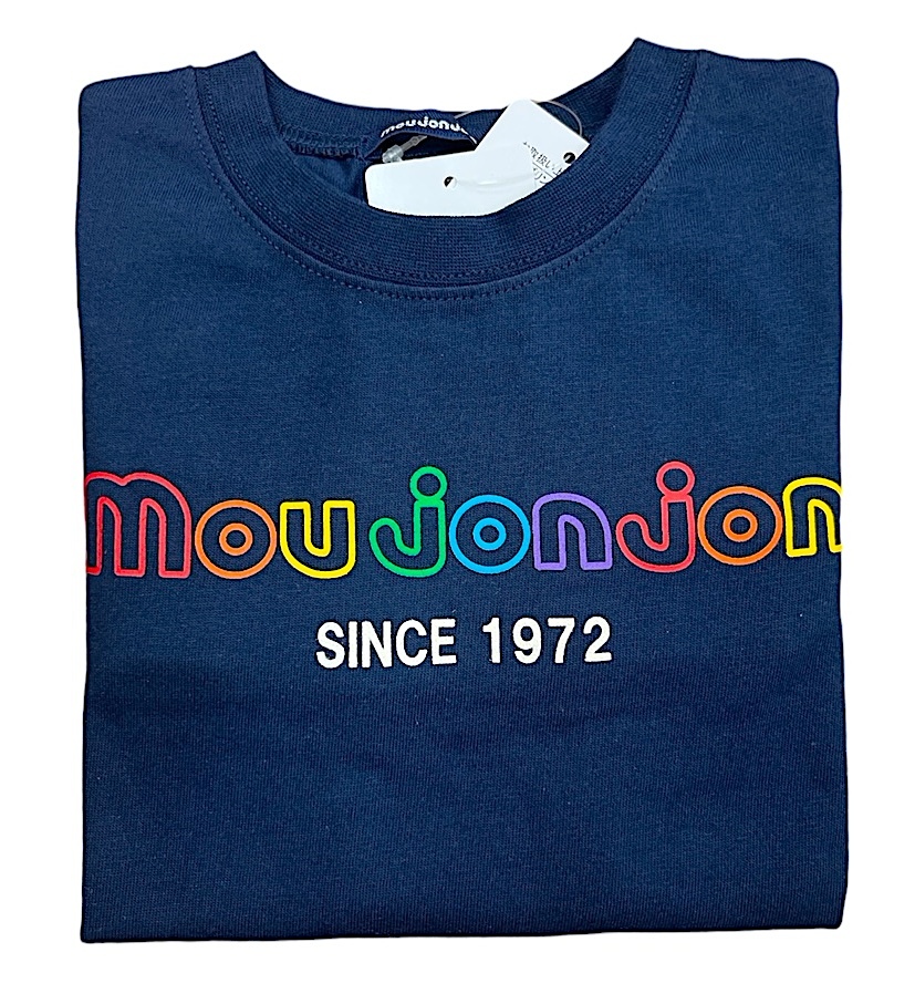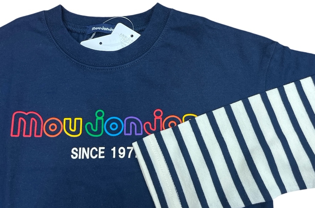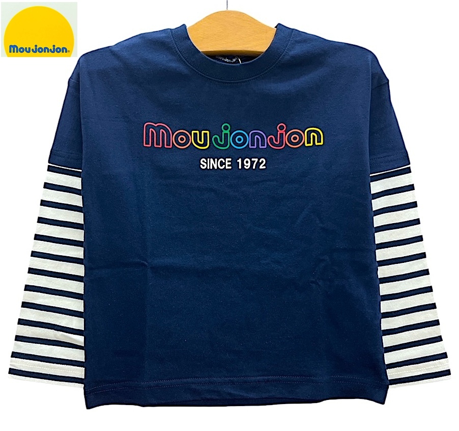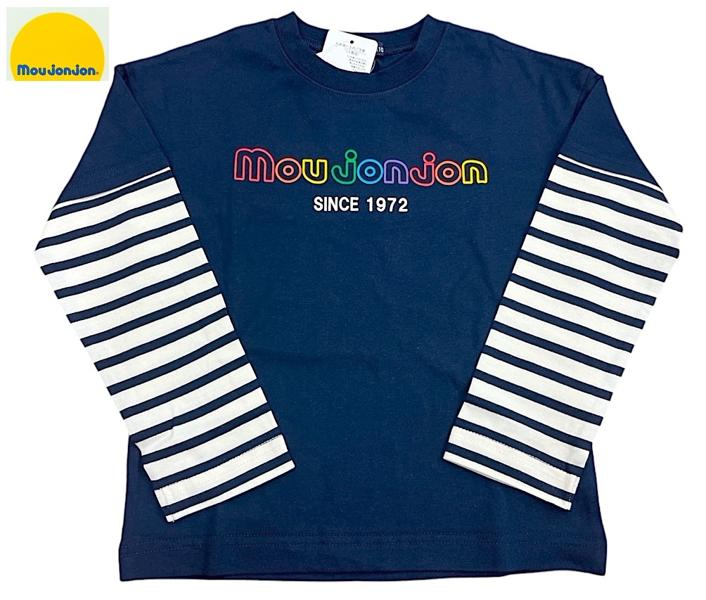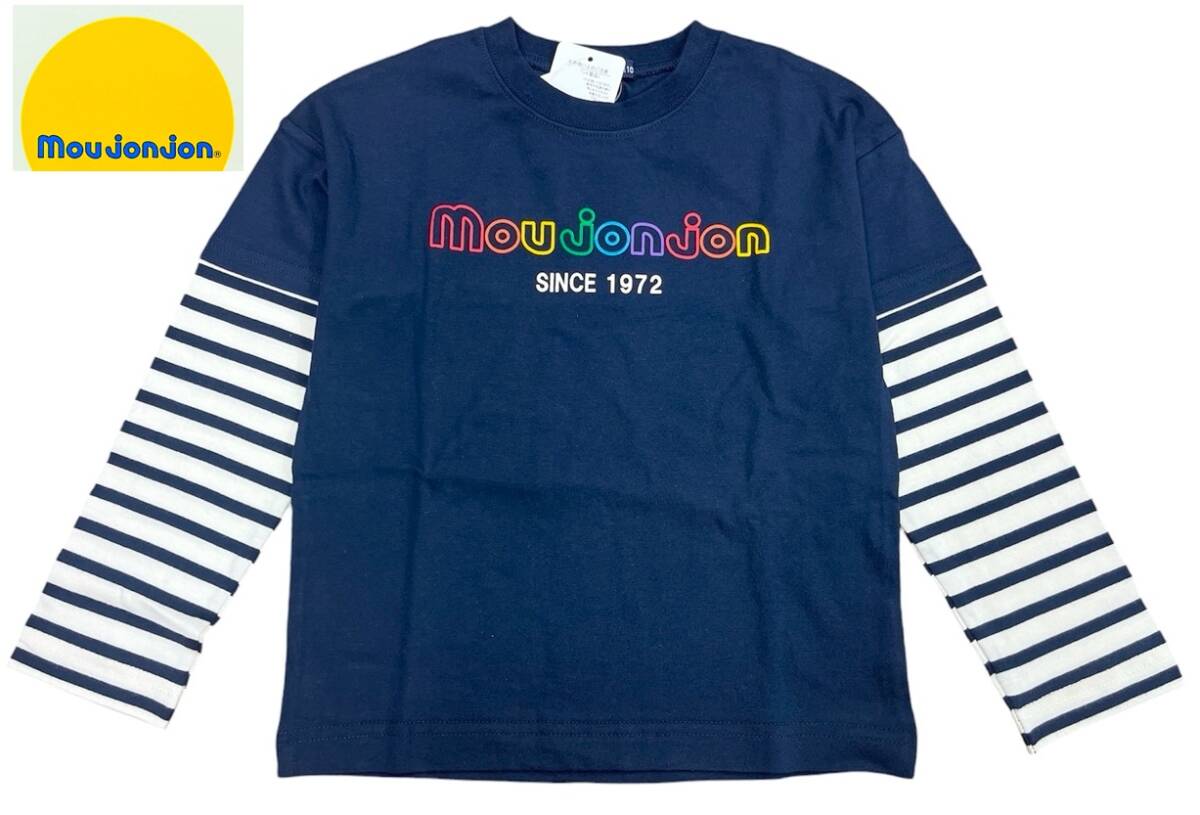 即決 新品タグ付 Moujonjon ムージョン★胸ロゴ 袖ボーダー 天竺 長袖Tシャツ★良質素材★100cm 3-4才 ¥1760