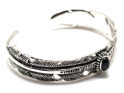 フェザーモチーフのセンターにオニキスをセットしたクールなバングル。オニキスをはさむように並べられたキュービックジルコニアダイヤもポイントです。煌びやかなネイティブ系バングルで他者と差をつけたい方に是非、オススメします』