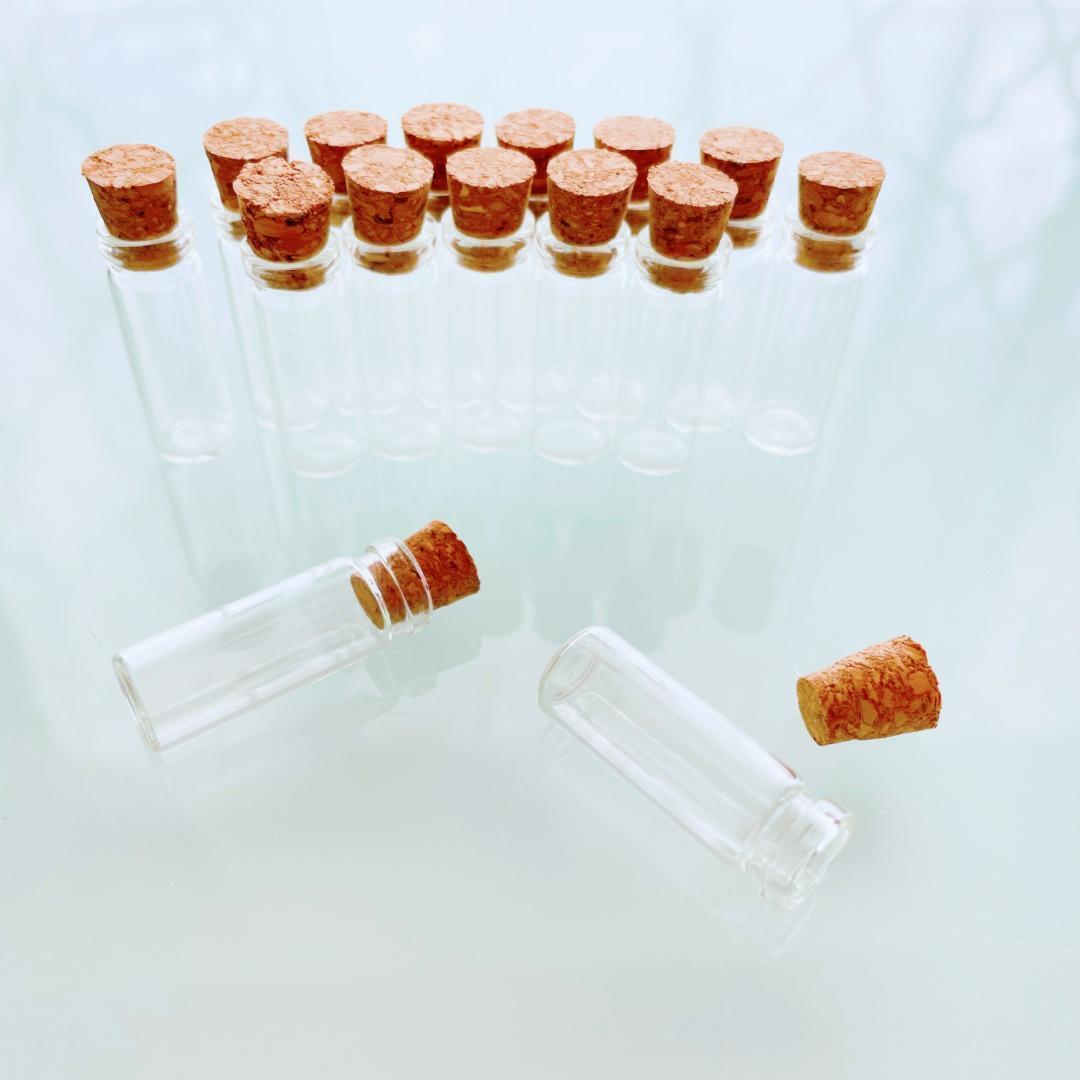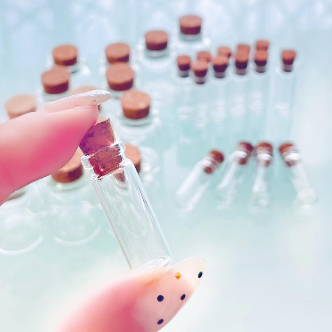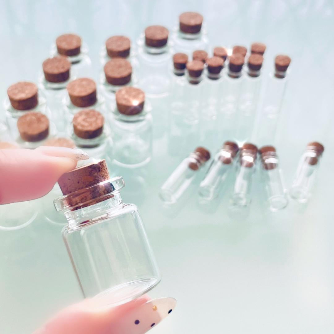 小さな透明ガラスボトルにコルク栓がついた可愛い小ビンです。