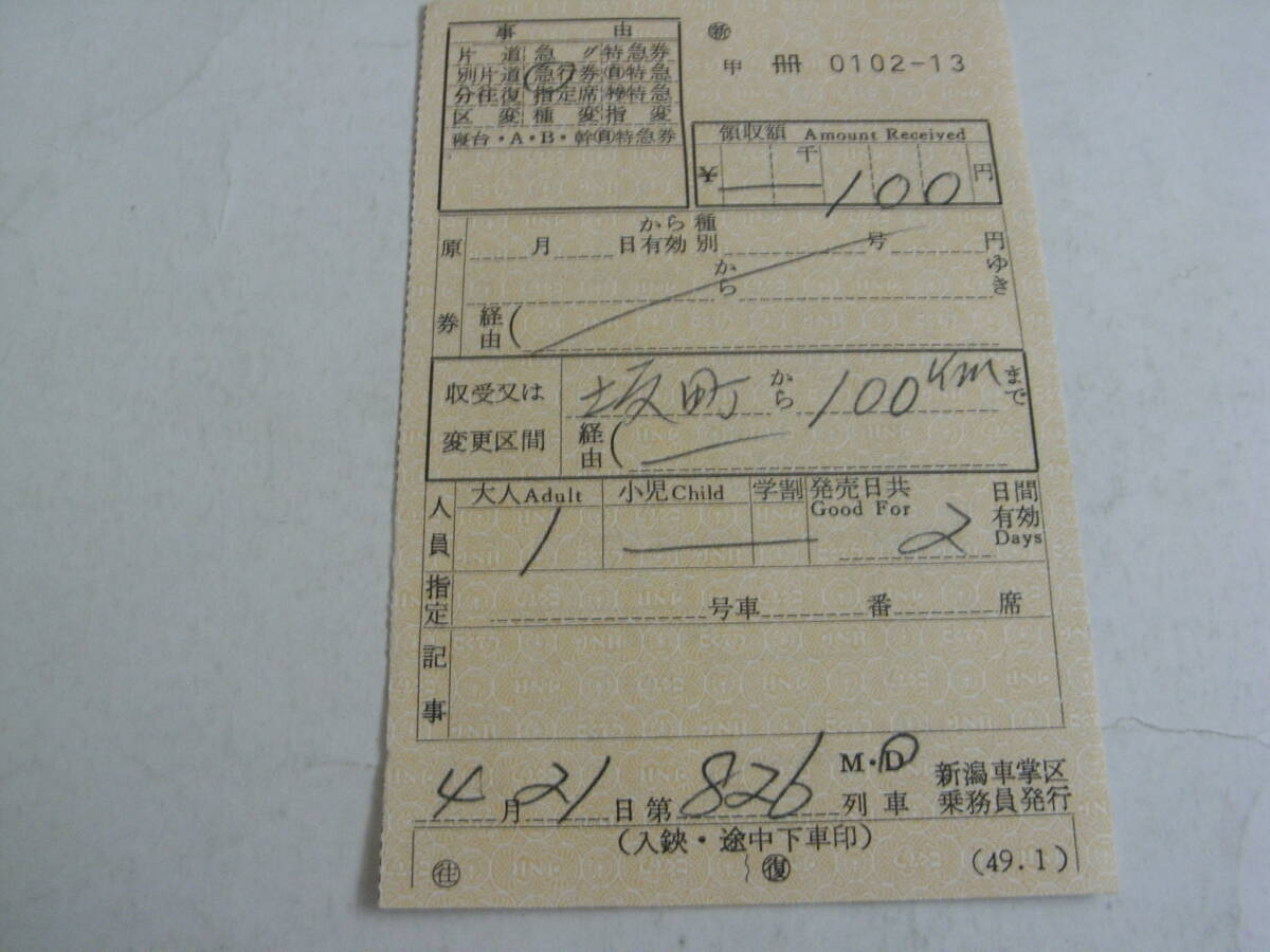 国鉄 車内補充券 新潟車掌区乗務員発行 0102-13 昭和49年頃?