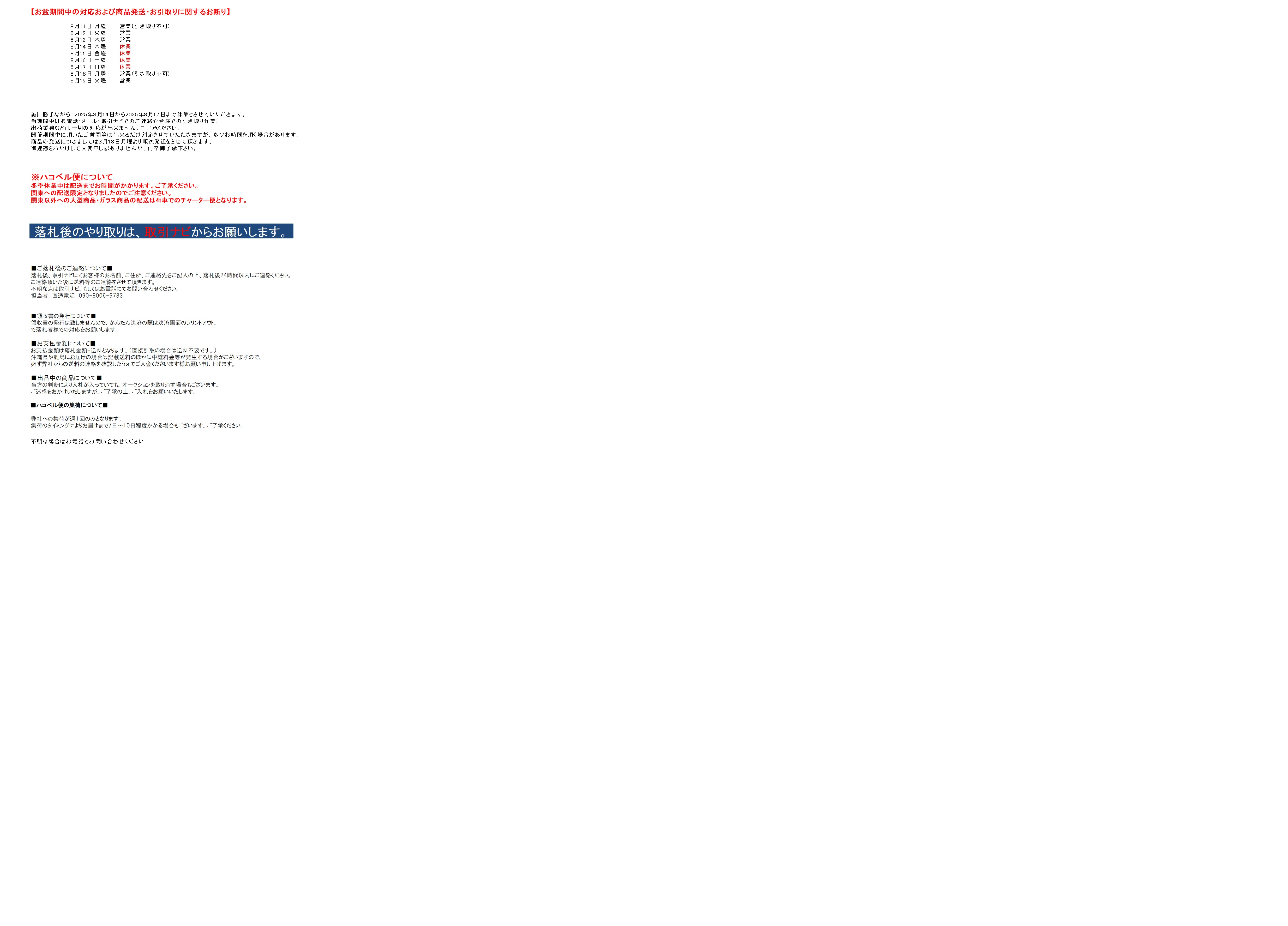 長期間のお取置きはお断りしております。(落札日から7日以内の発送が限度です。)