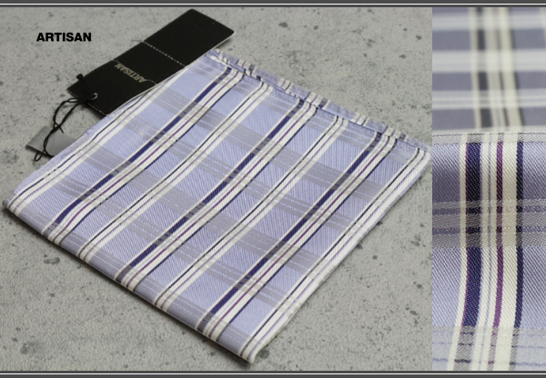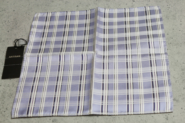 新品アルチザン高級シルク チェックハンカチ薄紫/絹定価6300円