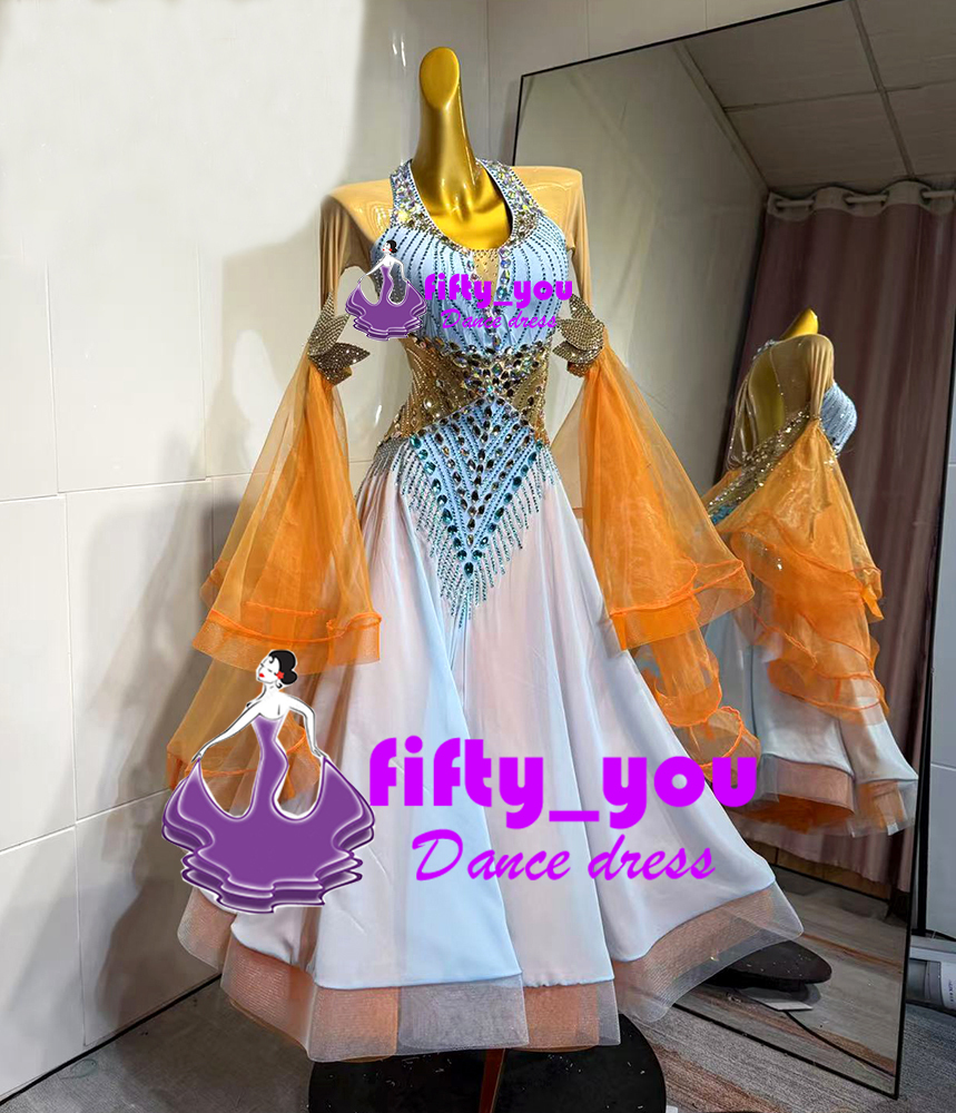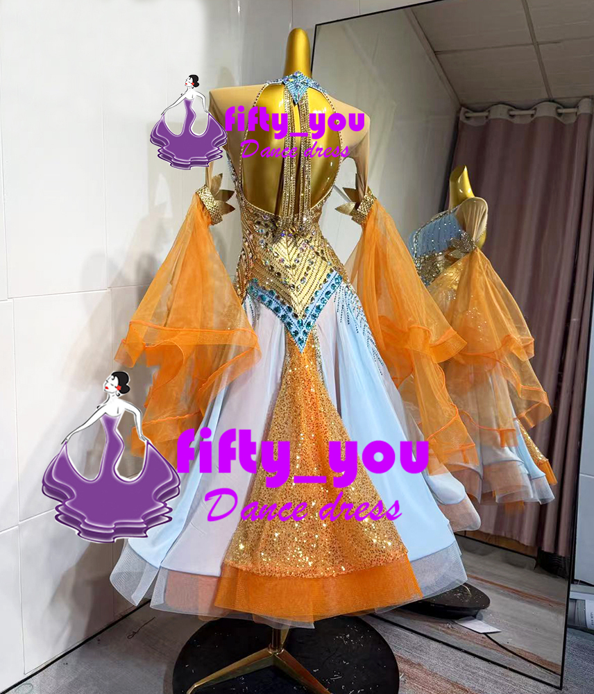 新品fifty_youレディース社交ダンス衣装 サイズセミオーダー モダン競技試合デモドレス  スタンダードドレス 水色+オレンジのミックス
