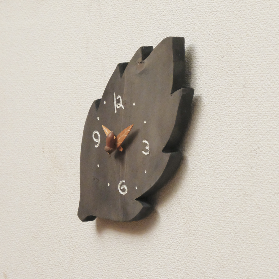 ツガの20ミリ材を使用 。色はグレー文字は彫刻 針は木材で秒針はどんぐりでスムースに動くタイプです。