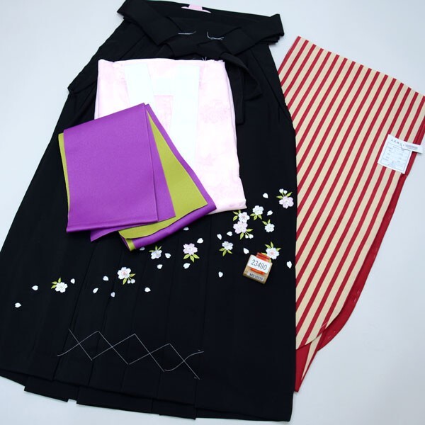 項目 | 着物袴フルセット(適合身長:144cm~150cm:ジュニア用へお仕立て直し致します。) ・二尺袖着物 ・二尺袖長襦袢(半襟付き) ・重ね衿(着物に縫いつけられています) ・袴 ・袴下帯(浴衣帯にも使用できます。) |