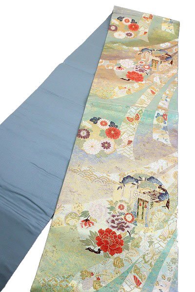 | 【着物フィ】美品 袋帯 ブルーグレー系 箔糸 御所車 吉祥花 吉祥文様 金糸 長さ4m41cm フォーマル お洒落 正絹 仕立て上がり m-6752 |