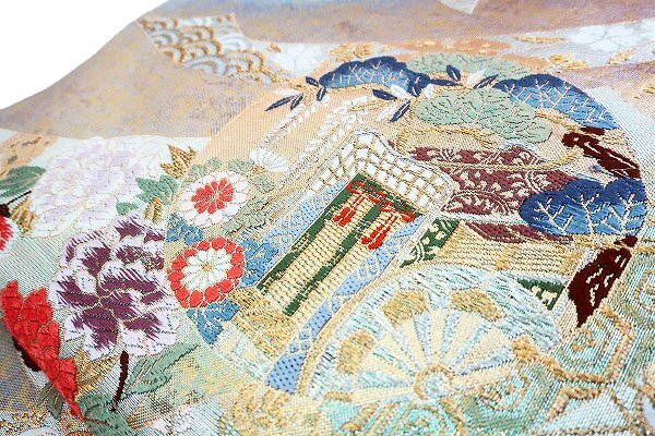 ブルーグレー系地に御所車や吉祥花などの吉祥文様が織り込まれた袋帯です。 箔糸が輝く大変華やかな一本です。 担当:前田 |