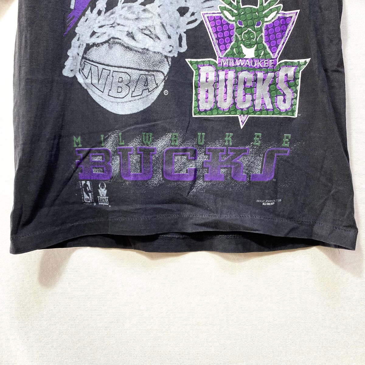 ■ 小さめサイズ 90s 90年代 ビンテージ NBA BUCKS バックス イラスト シングルステッチ Tシャツ サイズM ブラック バスケ スポーツ 観戦■
