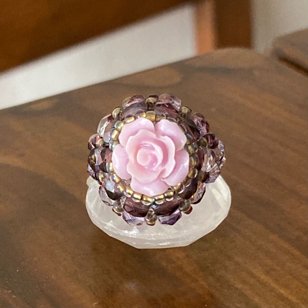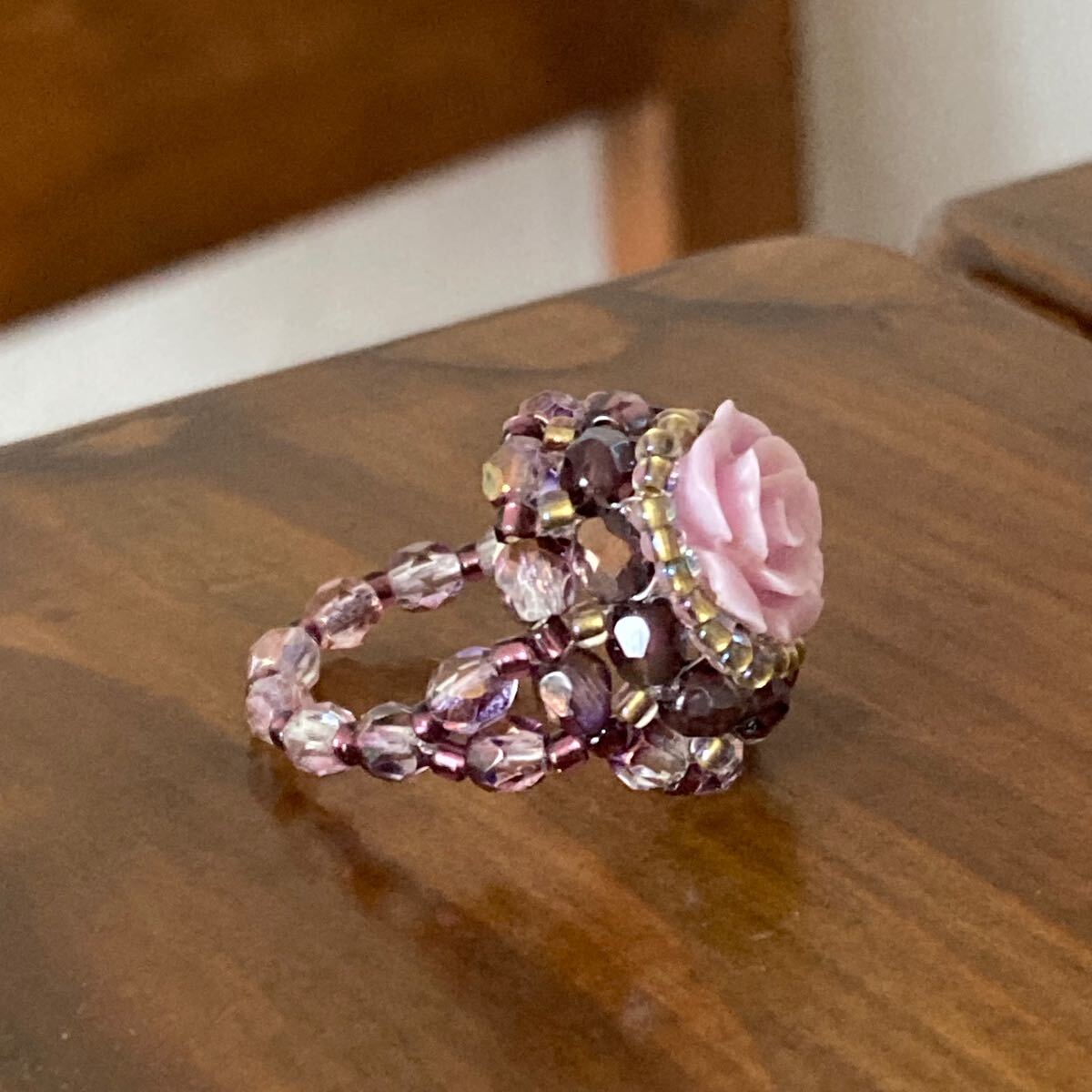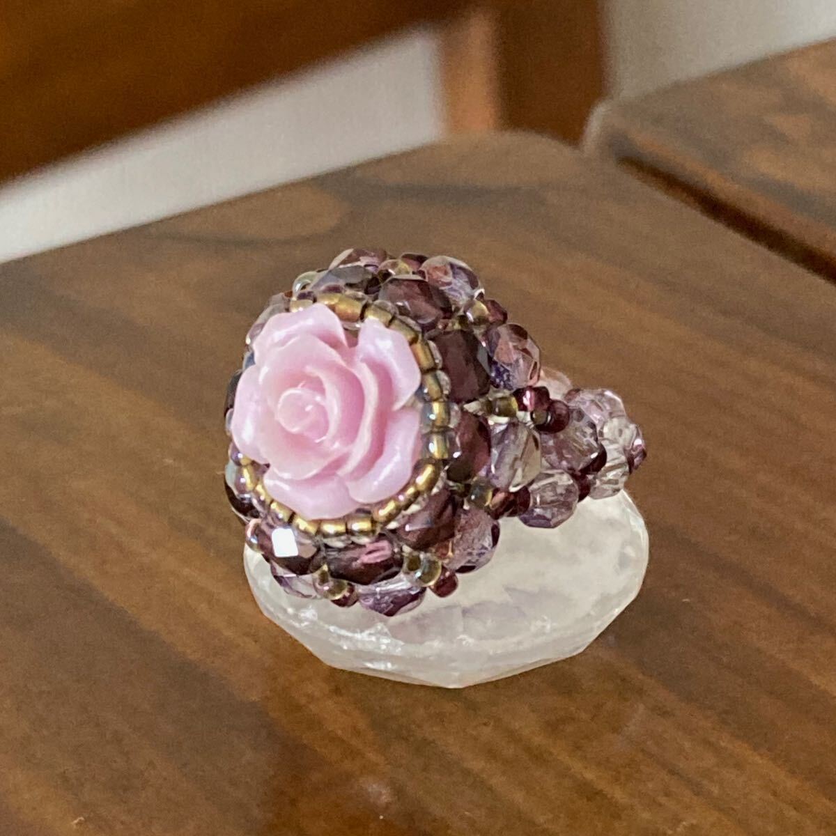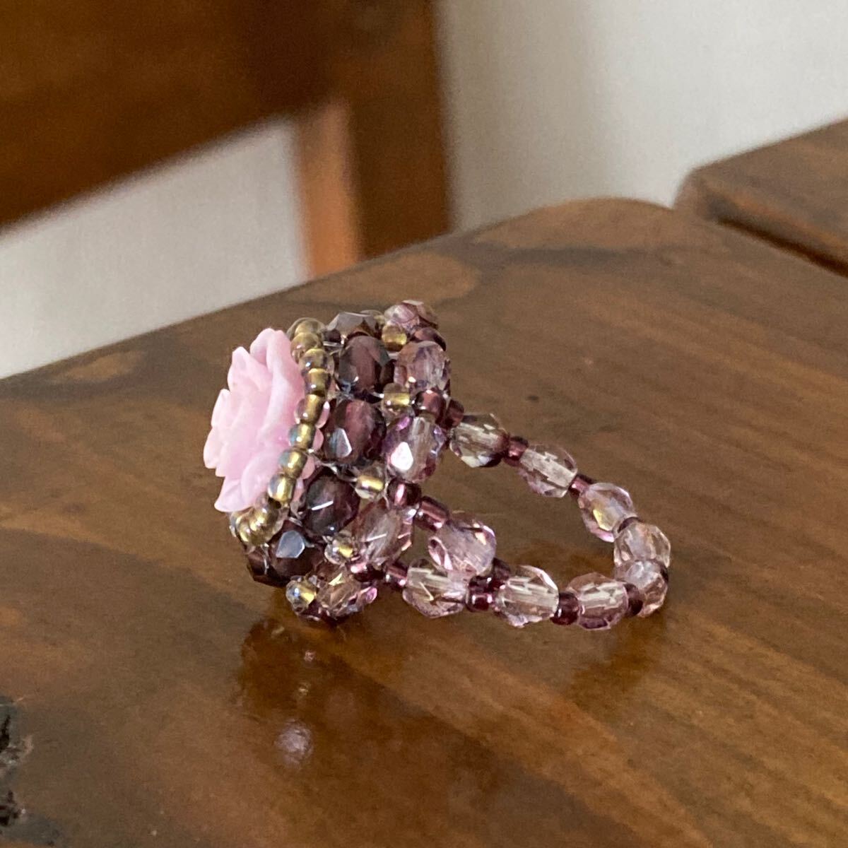 12mmの薄いピンクの薔薇ビーズ、4mmのパープル、クリアパープルのチェコビーズ、パープル、クリアゴールド系の丸小ビーズで作ったリングです。