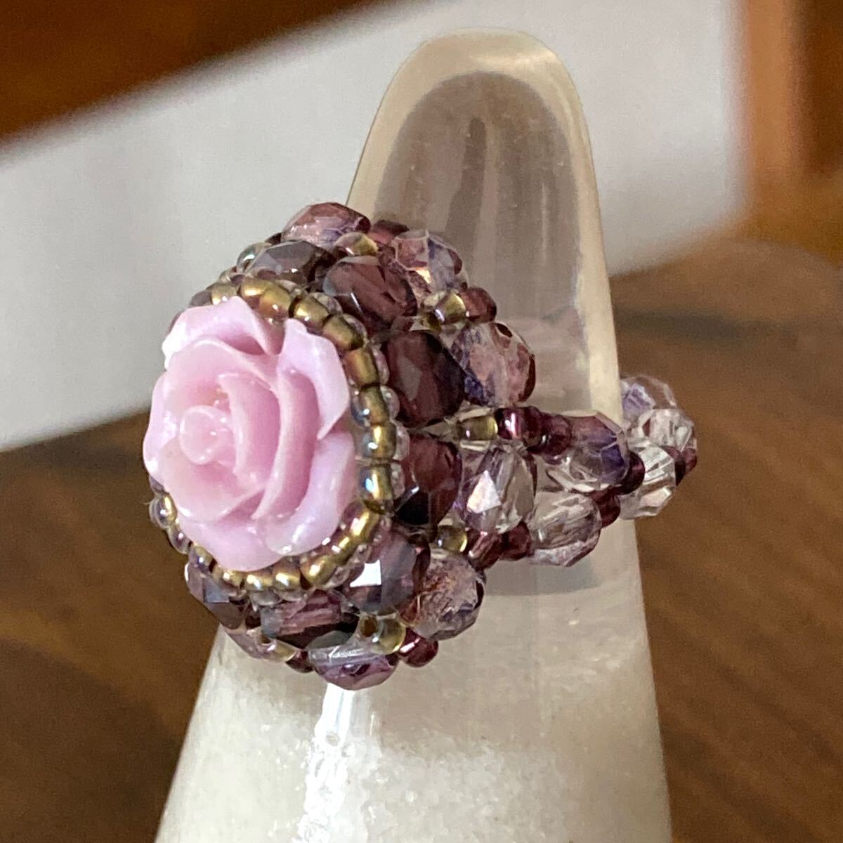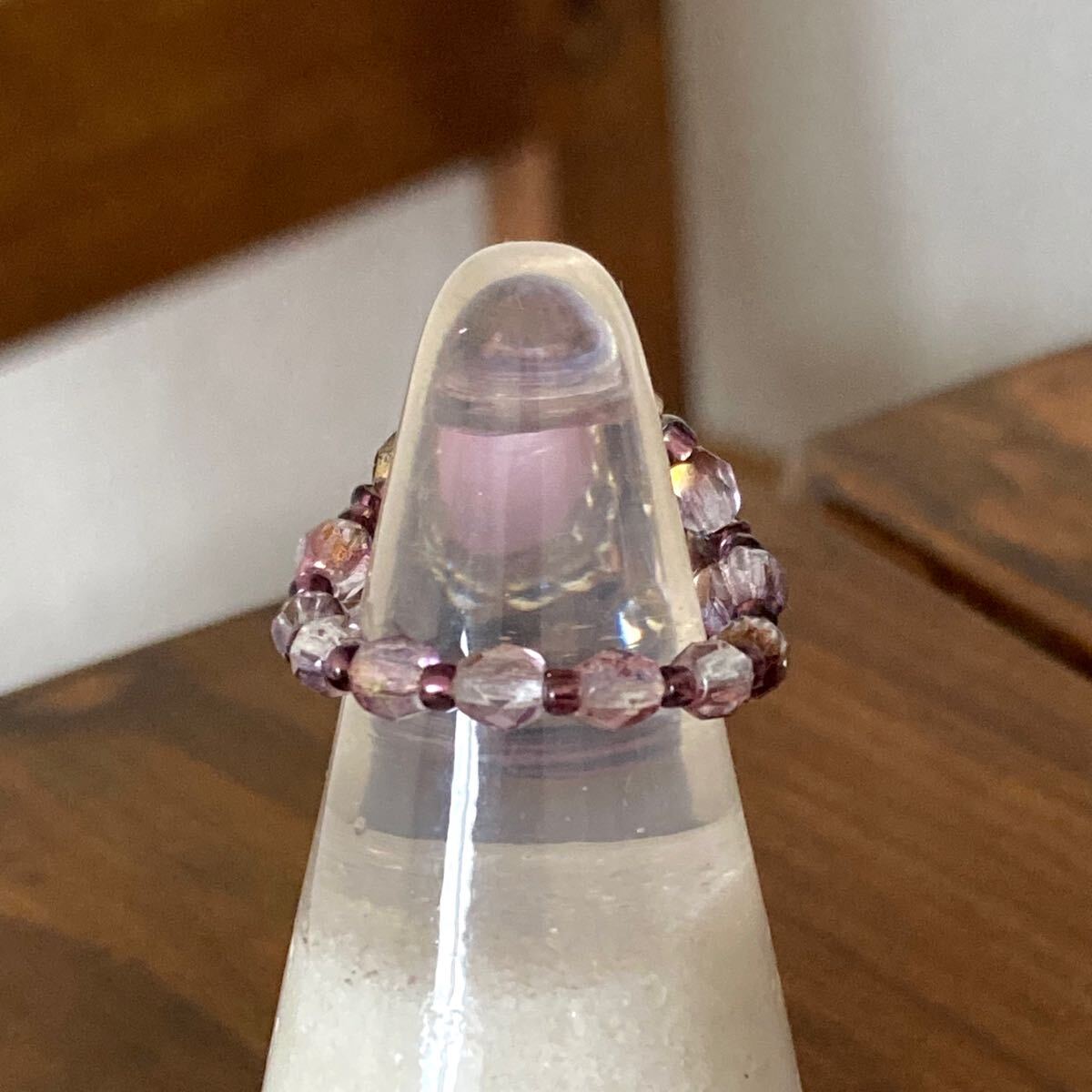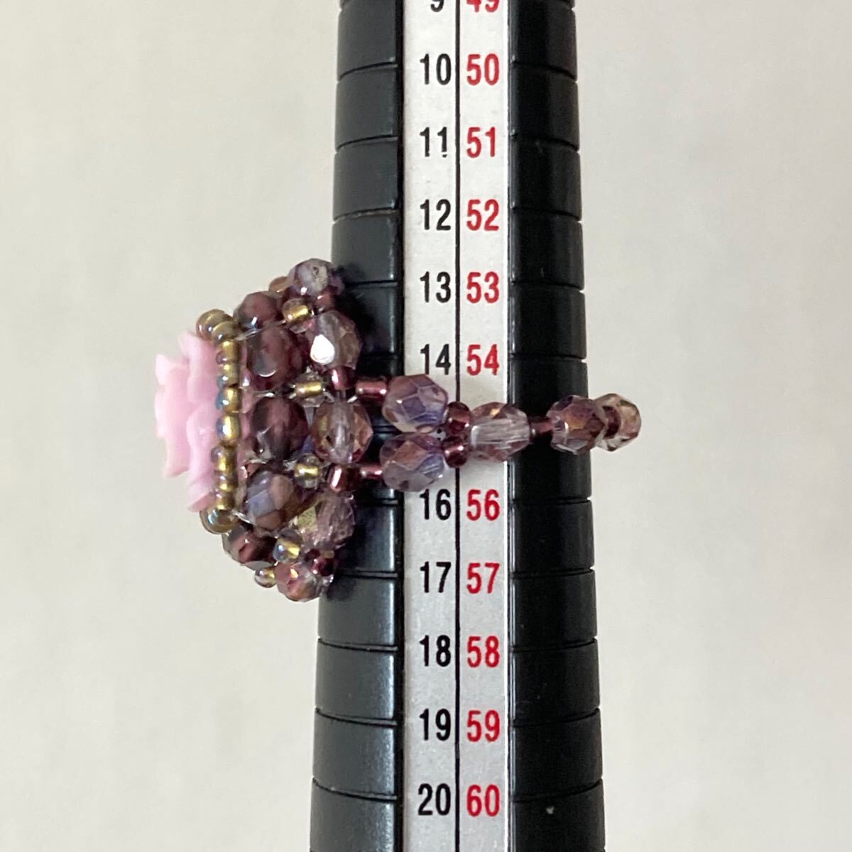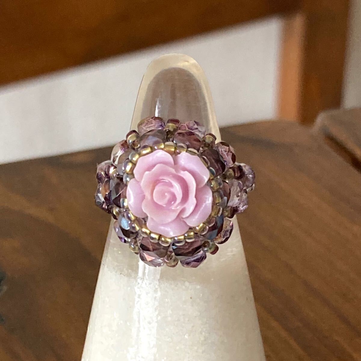12mmの薄いピンクの薔薇ビーズ、4mmのパープル、クリアパープルのチェコビーズ、パープル、クリアゴールド系の丸小ビーズで作ったリングです。