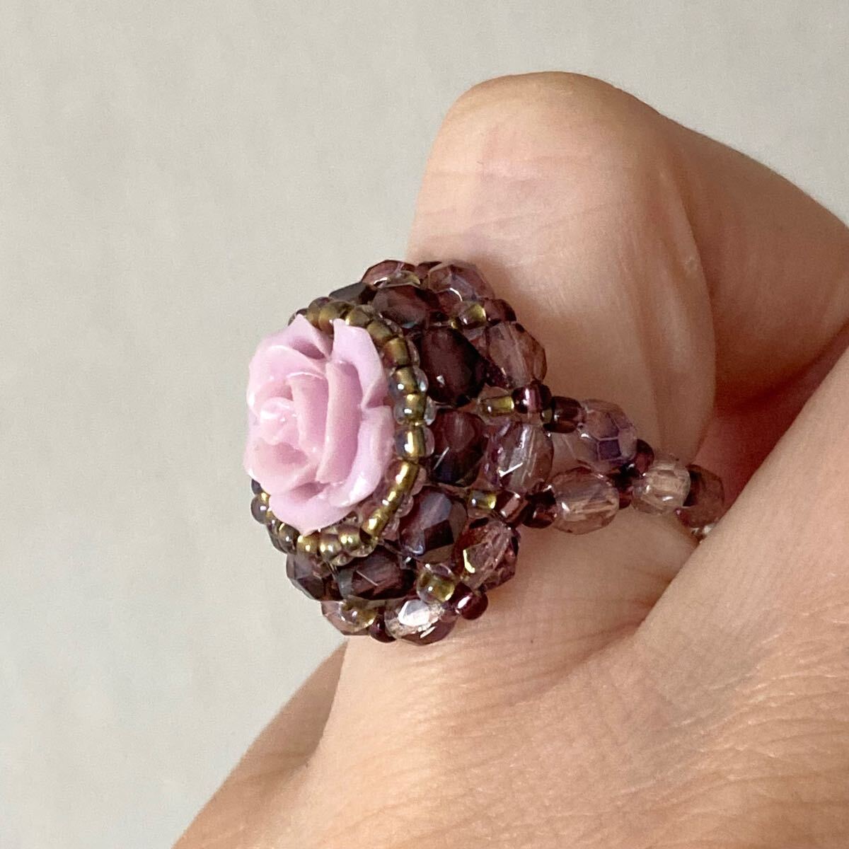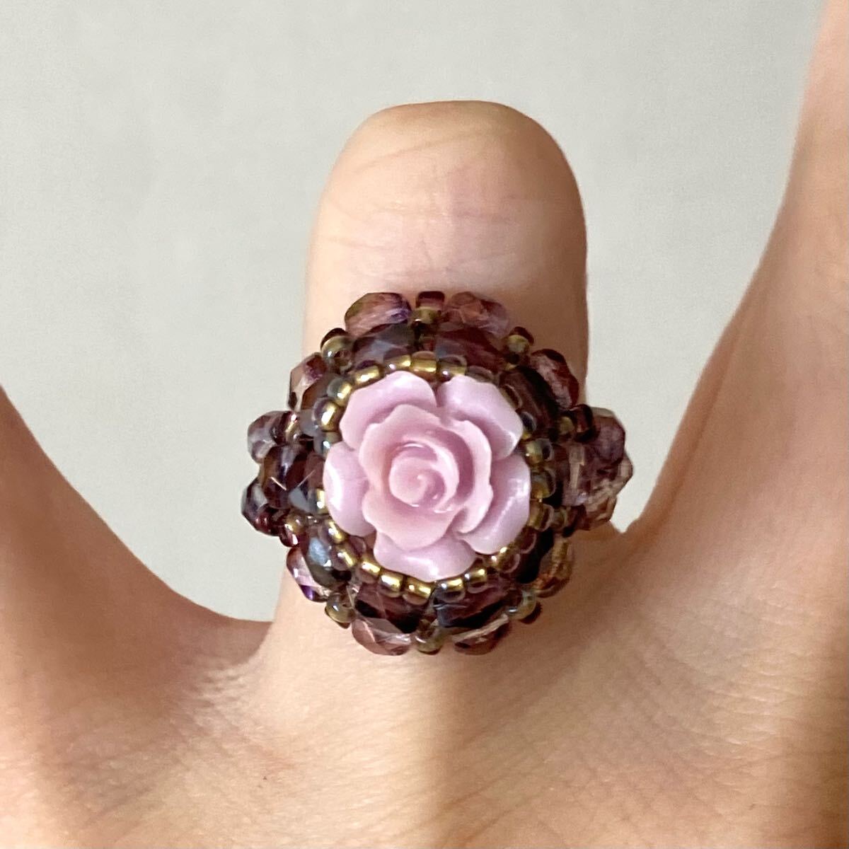 薔薇ビーズの周りを3重に編んだ可愛らしいリングです♪