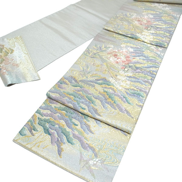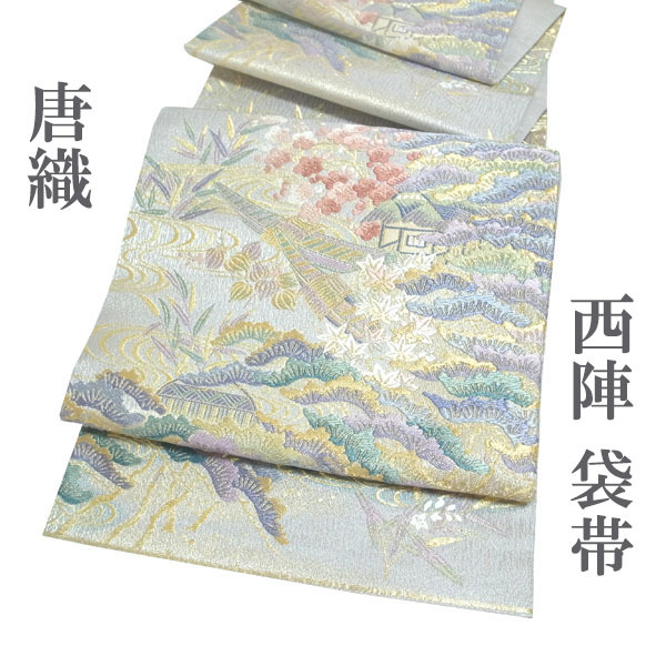 袋帯 京都 西陣 唐織 金銀糸 金糸 銀糸 金 銀 グレー 灰色 松竹梅 霞 流水 船 舟 フォーマル 結婚式 お茶会 七五三 入卒式 などに おしゃれ オシャレ お洒落 春 秋 冬 正絹 絹 リサイクル リユース 帯 おび オビ 上質 上品 粋 豪華 華やか なごみ 中古 仕立て上がり品 kp1667