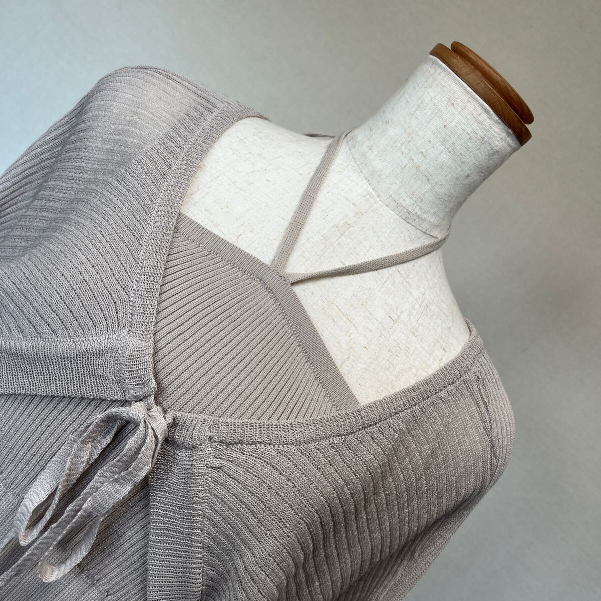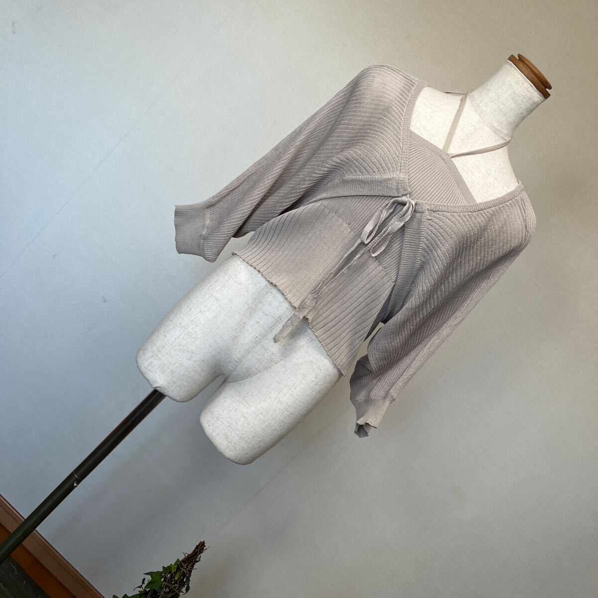新品のニットボレロとキャミソールの2点セット。 ボレロはゆるっとしたスリーブデザインとフロントリボンが可愛らしいデザイン◎ 旬のシアーニットで軽やかにスタイリングすることができます。 キャミソールにホルターネックのリボンがついているのもポイント。 セットでも単品使いでも着こなしが楽しめるうれしいアイテムです。5,940円の商品です 。