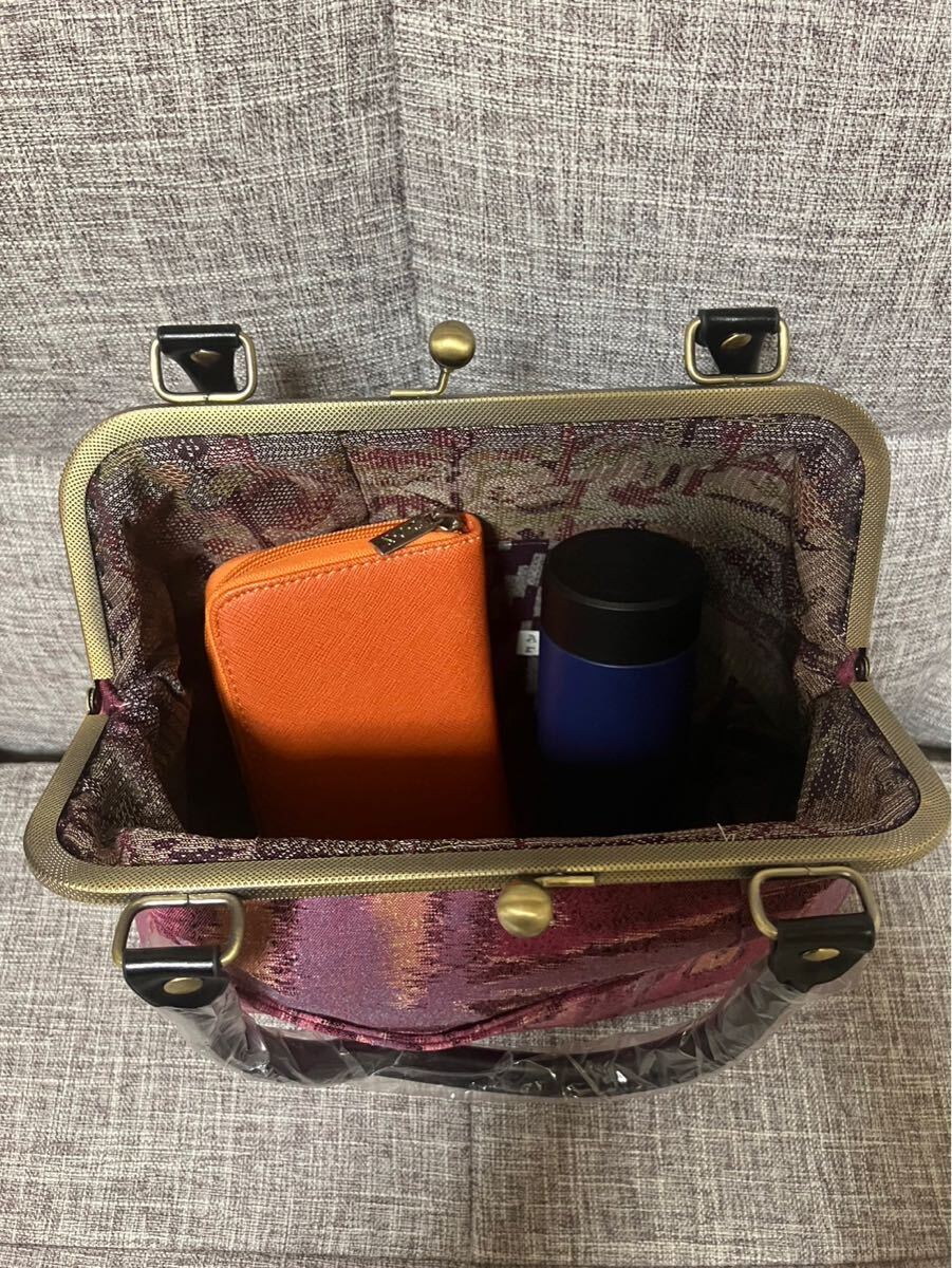 大きめの口金で、長財布や水筒など大きなものを入れることができます。