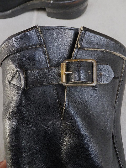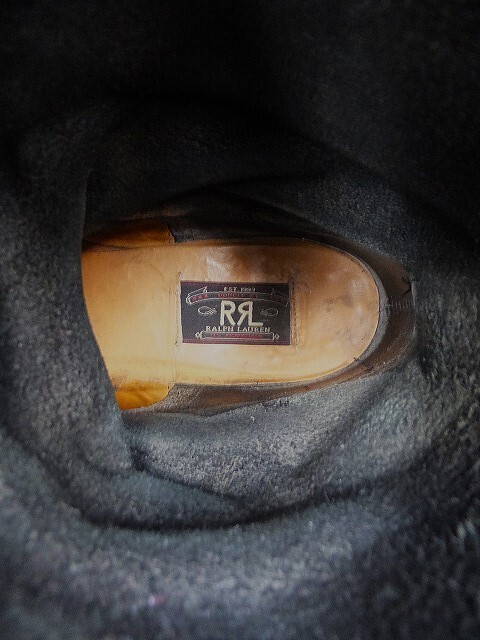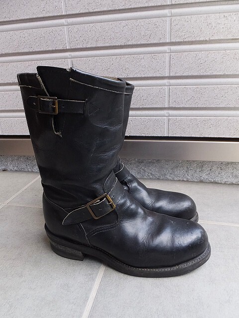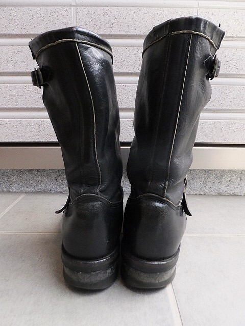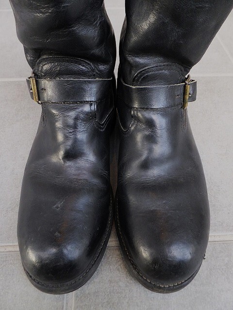 ビンテージRRL×CHIPPEWAのエンジニアブーツです。色はブラックです。90年台のダブルネームでかなりレアです。サイズはおそらくUS9ですがシャフトがレッドウイングに比べて細めです。革質も少しチープな風合いが魅力で価値のわかる方で探されてた方におすすめです。表記サイズは?、アウトソールは約29,5cmです。状態は画像にあるようにつま先に傷とかかとの減り等の多少のダメージはありますがまだまだ着用可能ですご理解の上ノークレーム、ノーリタン厳守、お取引が1週間以内に完了できる方のご入札をお待ちしています。また発送は当方の都合により週末となってしまいますのであらかじめご了承ください。