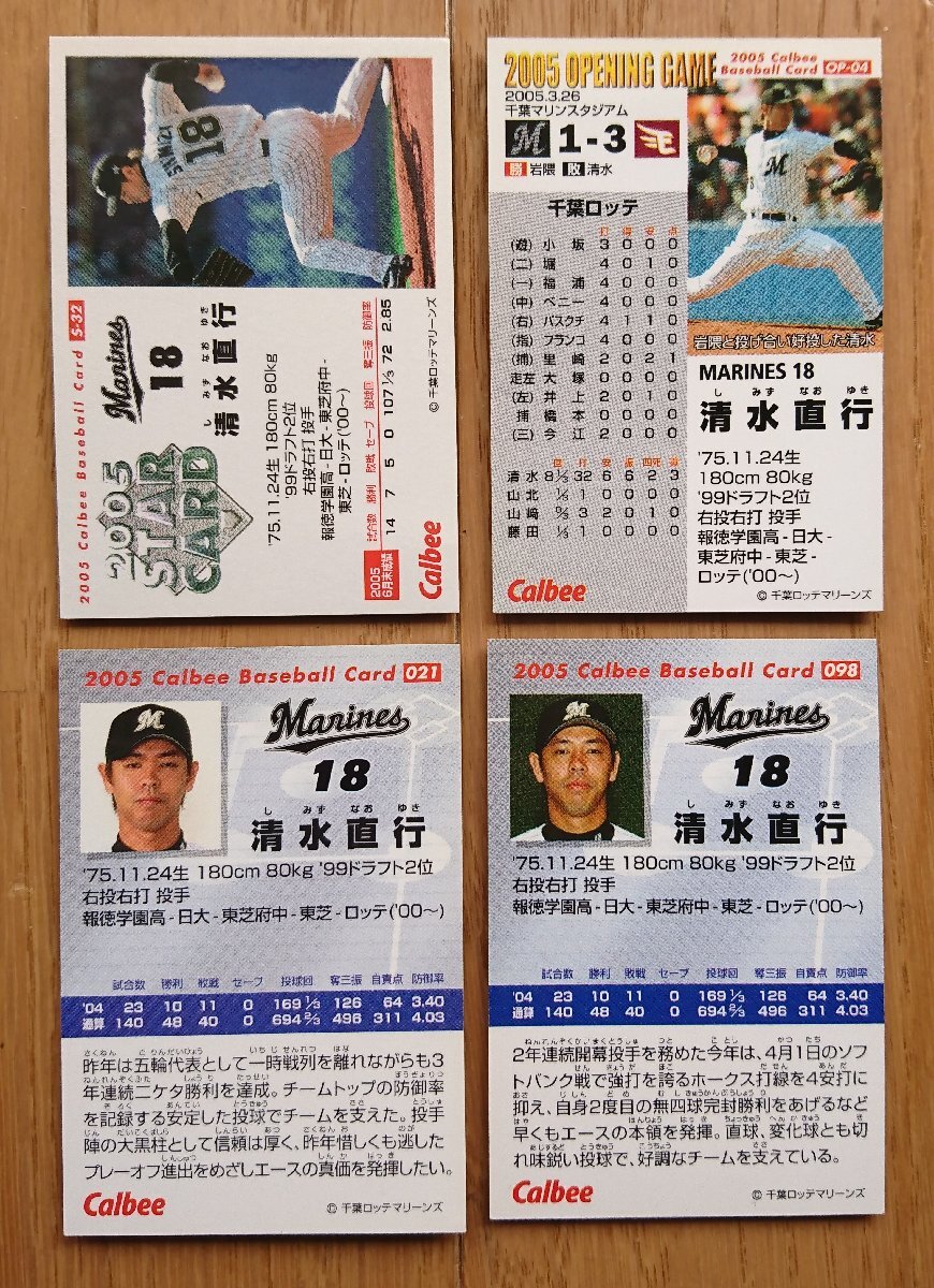 【カード・カルビー2005年】清水直行 S-32 スターカード/OP-04 開幕戦/021/098 計4枚セット 千葉ロッテマリーンズ プロ野球チップス