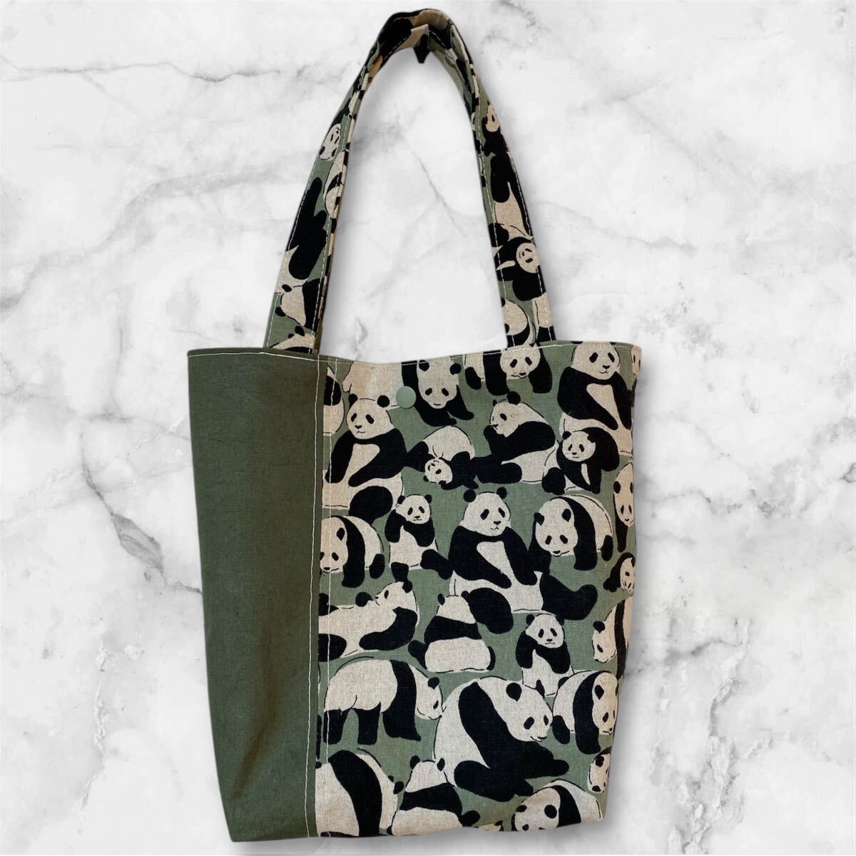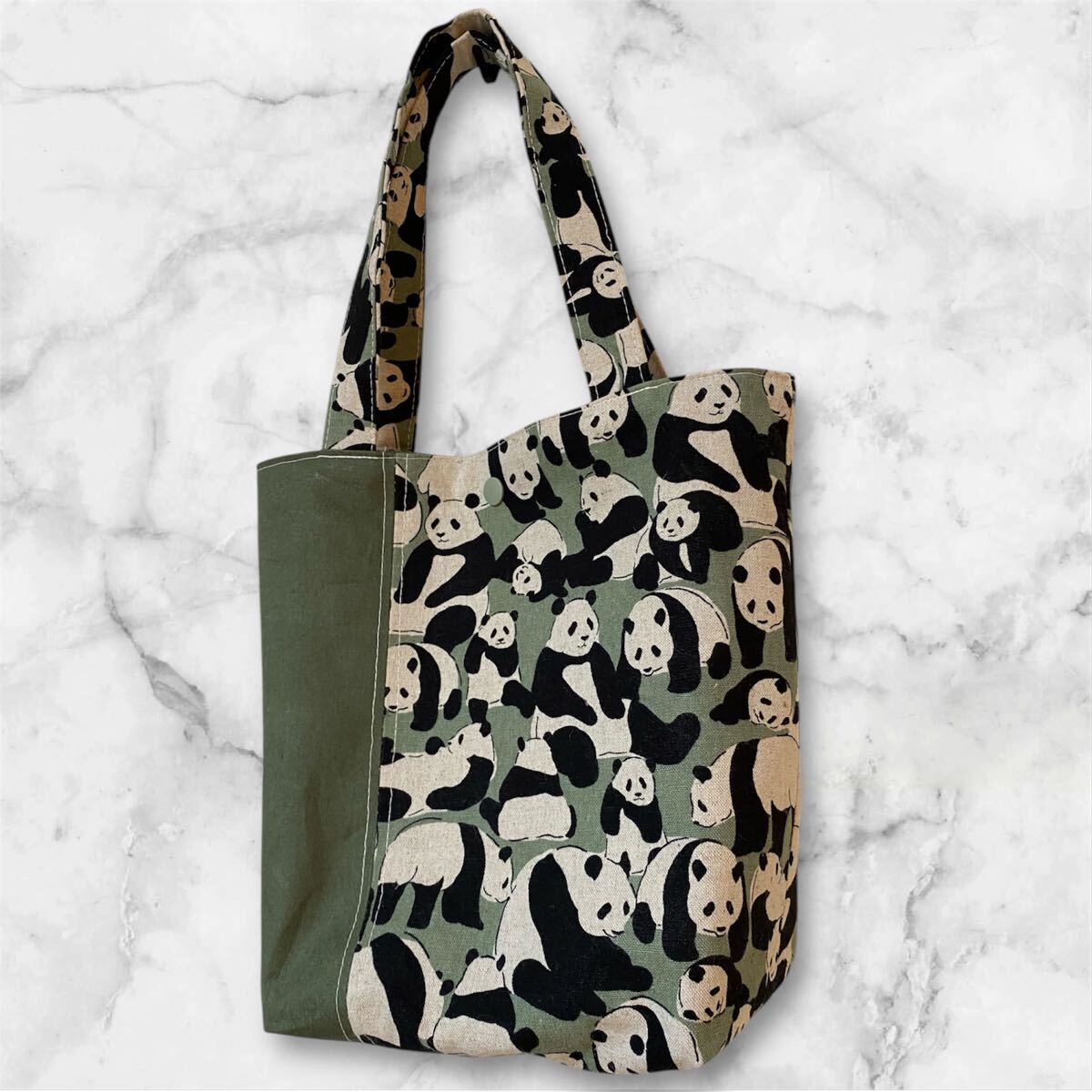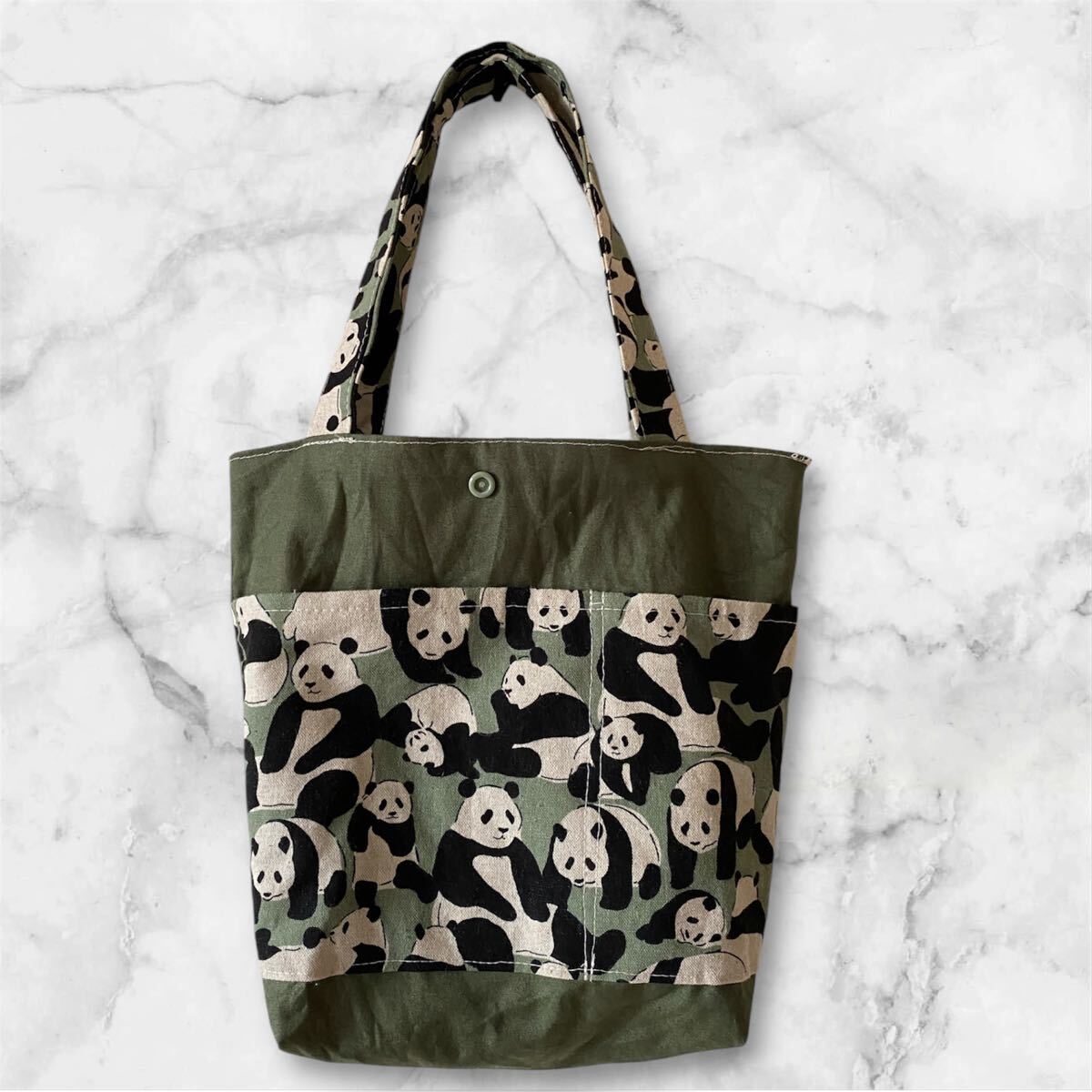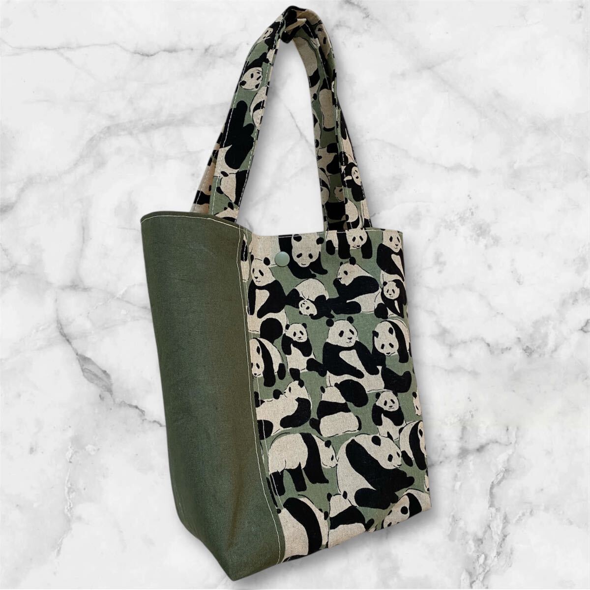 可愛いパンダ柄の生地とモスグリーンの11号帆布を切り替えた柔らかなミニトートバッグです。内側にバッグ幅と同じ幅のポケットを作り2室に区切っています。4枚目の写真は本体をひっくり返して内ポケット側を撮影しています。