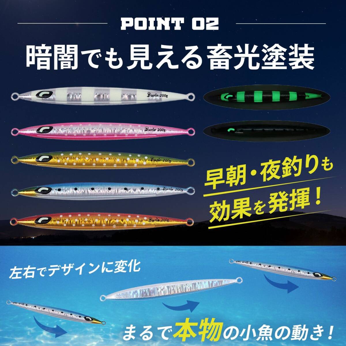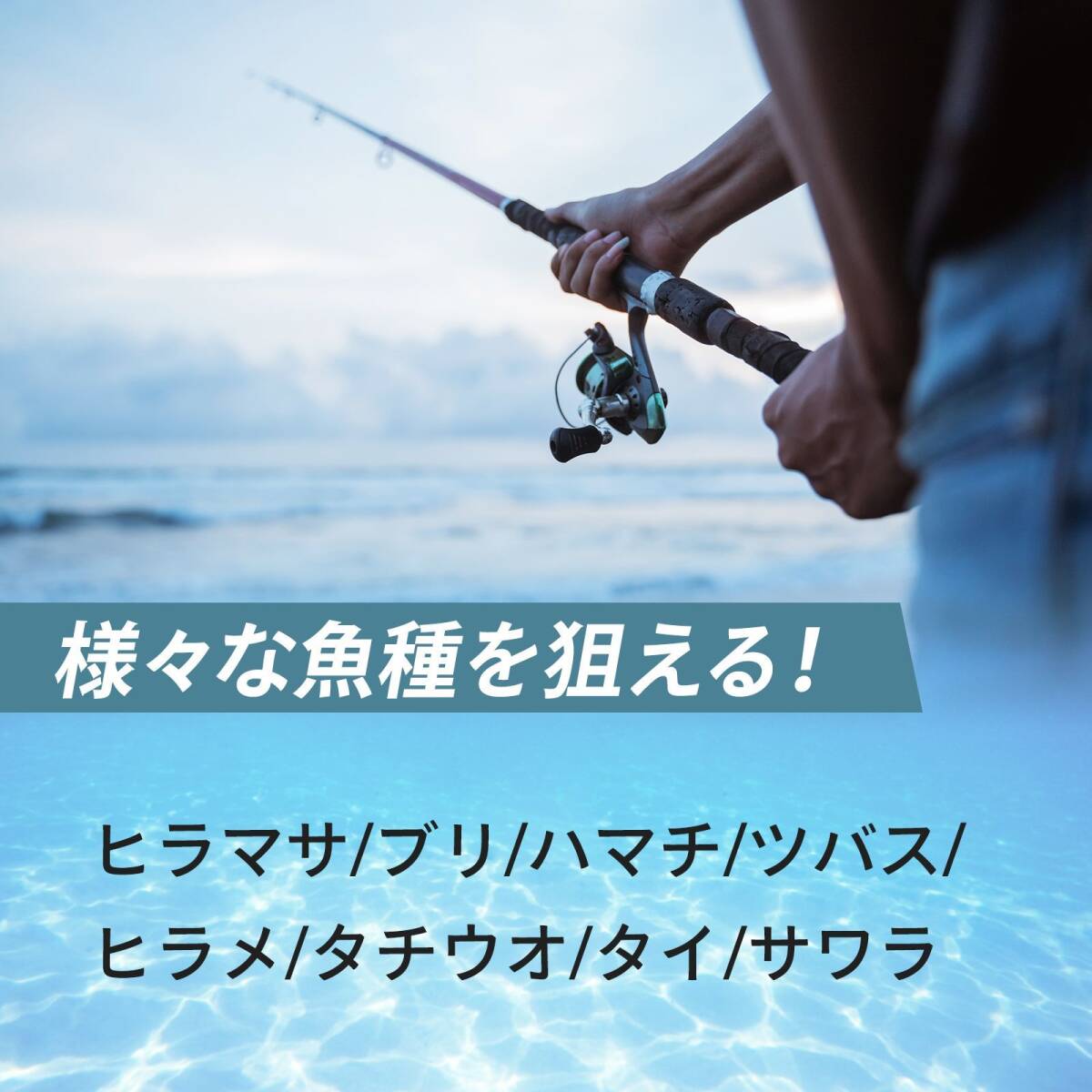 深海釣りや遠投に最適で、マグロ、カツオ、ブリ、ヒラマサなどの大型魚を狙います。夜光効果付きで太刀魚やタチウオにも効果的。シーバスやヒラメ、タコ釣りにも使えるメタルジグセットです。