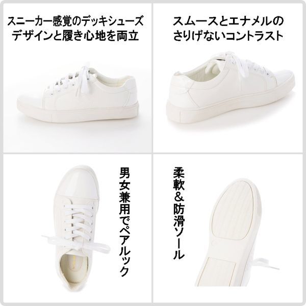 スムースとエナメルを合わせた 2トーン デッキシューズ。