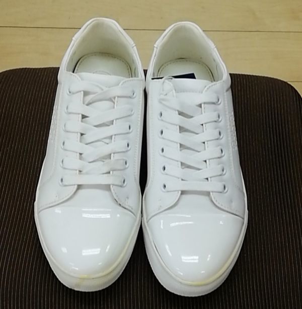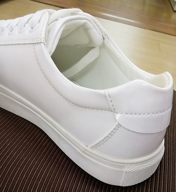 つま先とかかとに存在感あるエナメル材を使用、サイドにエンボス加工を施すことでトレンド感がアップ。