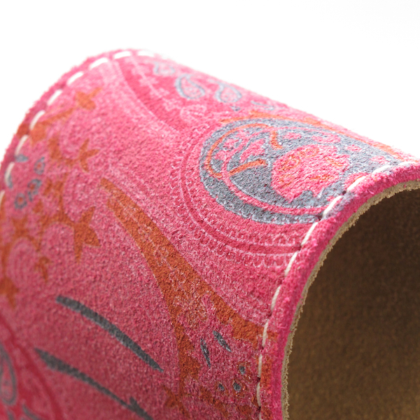 しなやかで柔らかく、肌触りの良いスエードレザーを両面に使用しています。使い込むほどに手になじみ味が増します。 シンプルで高級感あふれる仕上がりです。トップのスエード生地はペイズリー柄に着色されています。バックはナチュラルスエードです。幅の広いタイプです。