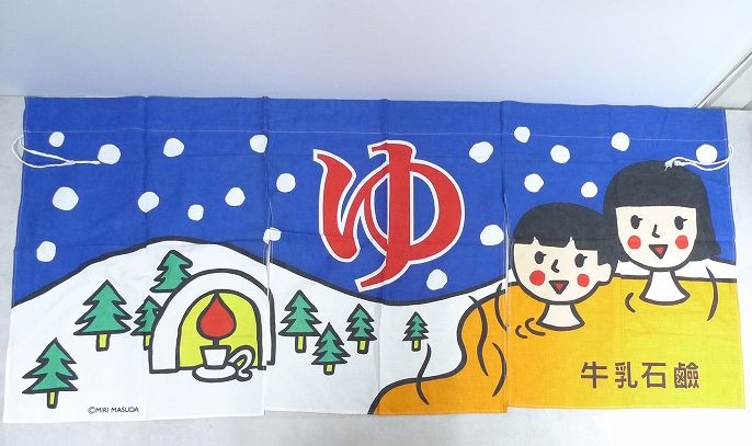 60NR02▲銭湯のれん・湯/ゆ・166cm×74cm・牛乳石鹸・かまくら 雪・古布・昭和レトロ・当時物・リメイク素材暖簾温泉風呂屋
