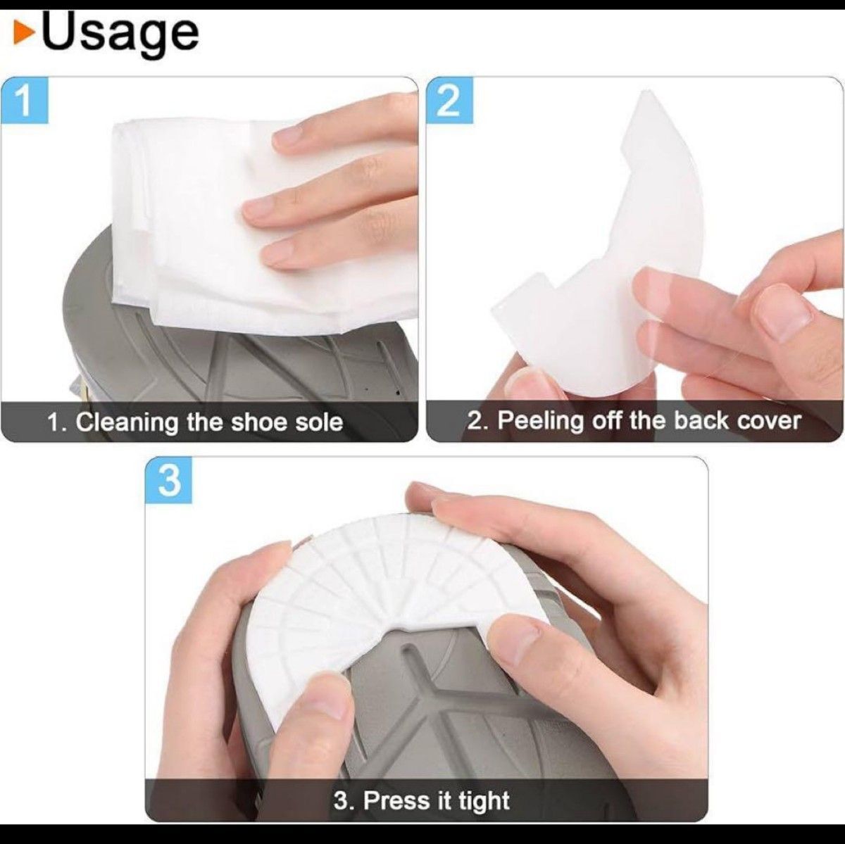 利用方法 - まず、靴底をきれいにして接着剤を塗ってから、製品の表面のフィルムをはがし、適切な位置を調整して約2分間強く押し、端に接着剤を丸く塗ってください。