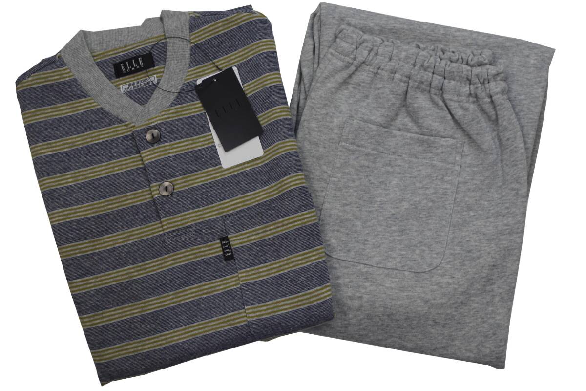 ■エル ELLE HOMMEの男性用、長袖&ロングパンツパジャマ、新品です。サイズはM、チェスト88-96cm、身長165-175cm、ウエスト76-84cm。パンツは前開き。胸ポケット付き。袖口、パンツ裾リブ(絞り)タイプ。素材は綿80%・ポリエステル20%、リブ部分綿95%・ポリウレタン5%。裏起毛で目安として主に秋・冬シーズンでお使いいただける生地感です。色はグレー系×ネイビー系×ダークカーキ系。正規ライセンス会社扱い品。税込定価14,300円です。