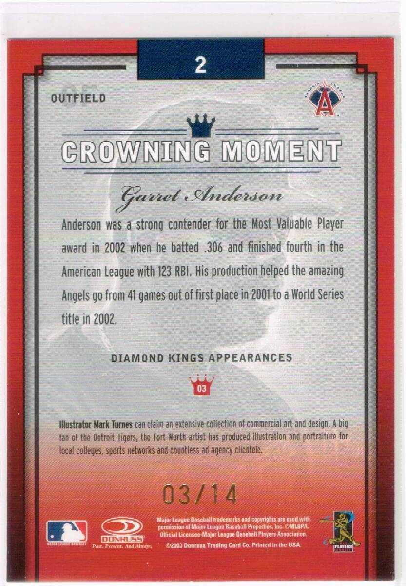 MLB メジャーリーグ ベースボールカード の 2005 Donruss Diamond Kings Recollection Collection Buy Back Autograph Garret Anderson シリアルナンバー 03/14 です。 終活のため、コレクションとして長年保管していたものを出品いたします。思い入れがあるカードですので大切にしてくださる方のお手もとに行くことを願っております。 サイズは90mm × 63mmです。 カードは入手後スリーブ、トップローダーに入れて暗所にて保管しております。一般的な常識の範囲内で保管をしておりました。その他初期傷や経年による自然劣化などはご容赦ください。カードの両面の画像を掲載しておりますのでご確認ください。 当方、喫煙者はおりません。 その他、何かご質問がございましたらお問合わせください。 | |