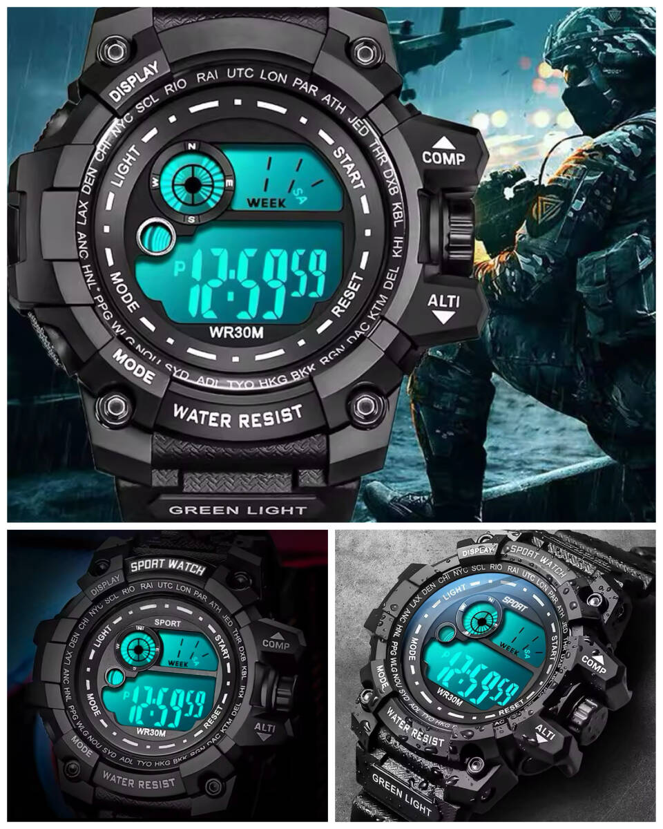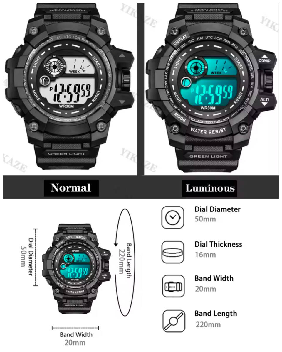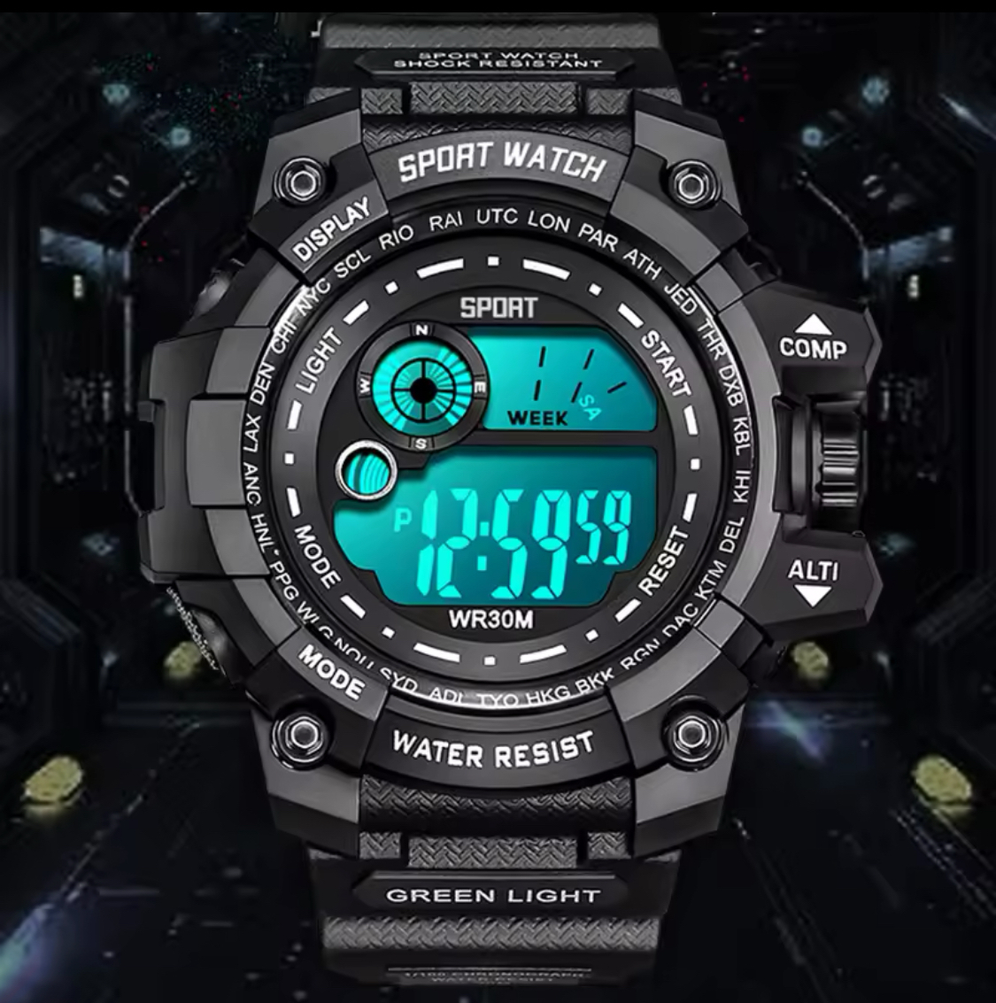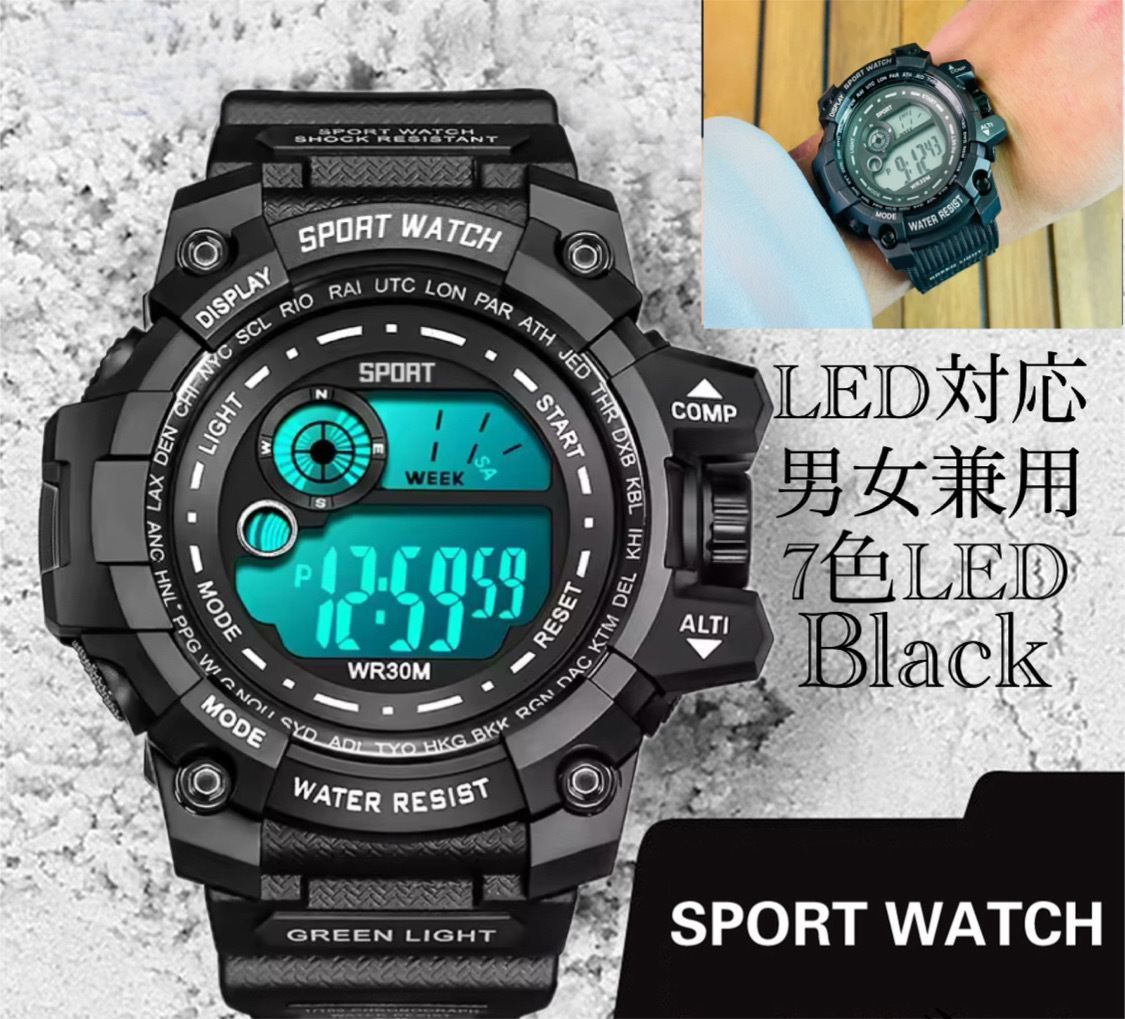 時間、曜日と日付のLEDディスプレイ ・アラームと時報 ・12/24Hフォーマットオプション ・ストップウォッチなど多機能ウォッチでございます。
