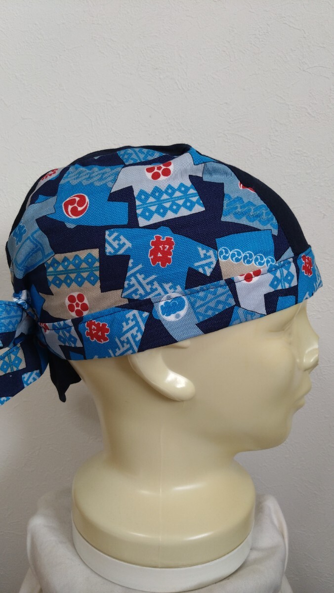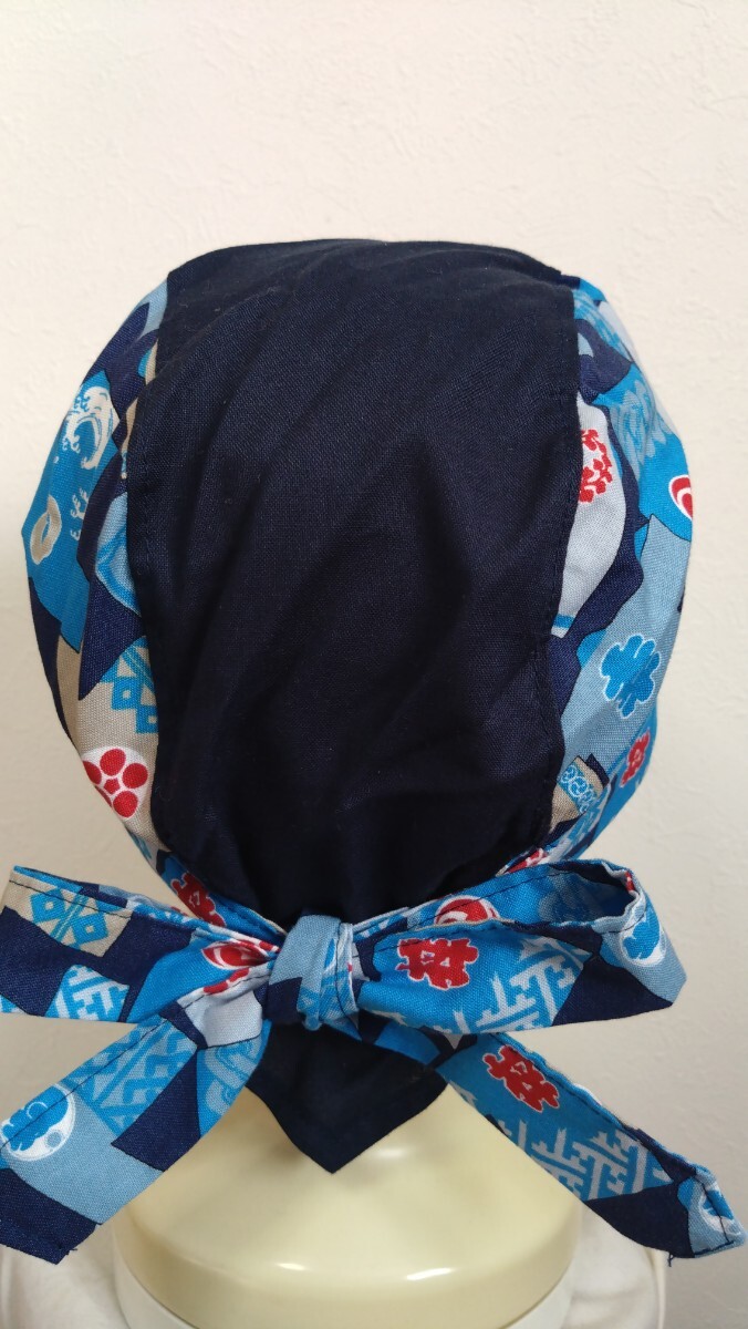短★バンダナキャップ★ハンドメイド 和柄 祭り×無地 はっぴ 法被 紺