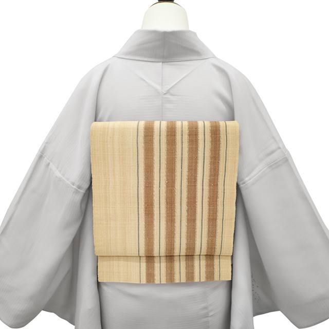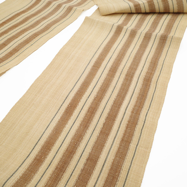 お色柄は自然味あふれる生成り色地に茶色や藍色の糸が用いられ、シンプルで美しい縞が織り上げられています。