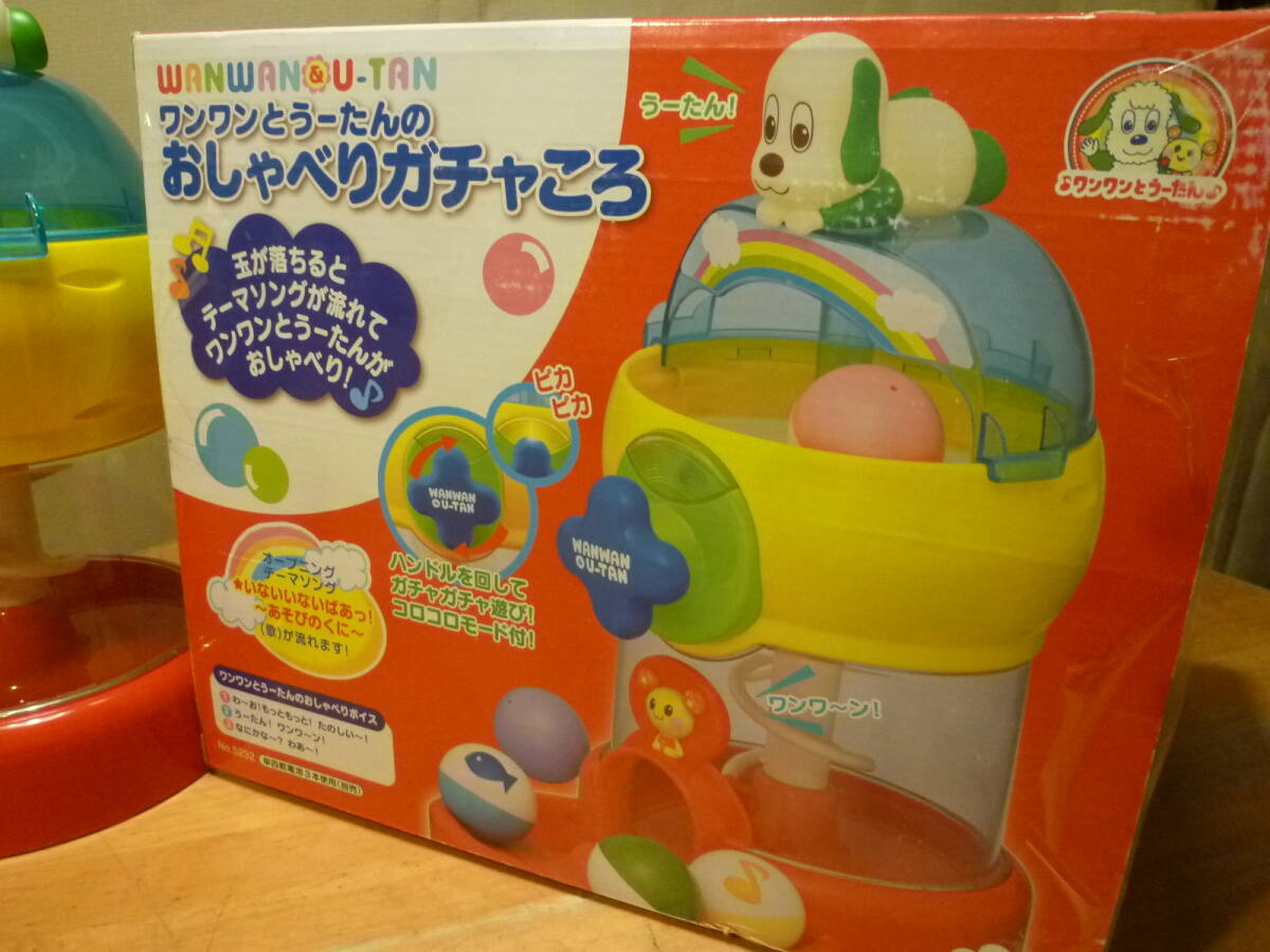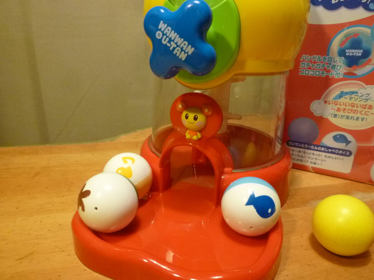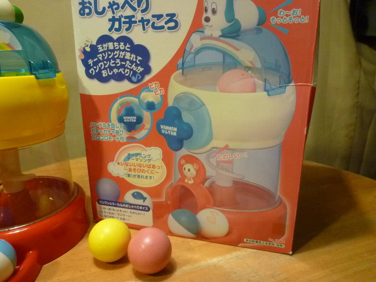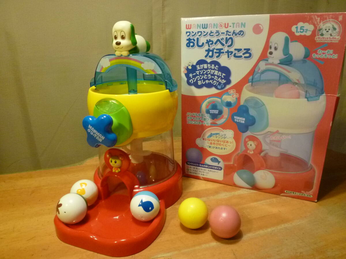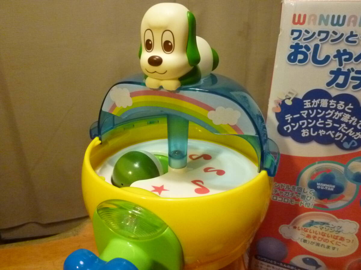 こちらは小さなお子様に大人気のテレビで放映のワンワンとうーたんのおしゃべりガチャころで、箱の見出しには、玉が落ちるとテーマソングが流れてワンワンとうーたんがおしゃべり!♪ ハンドルを回しガチャガチャ遊び! コロコロモード付!等とありますが、透明ドーム内部上(説明にはありますが少しやり難さあり?)に使用の新しいアルカリ単四電池3本は別となります。