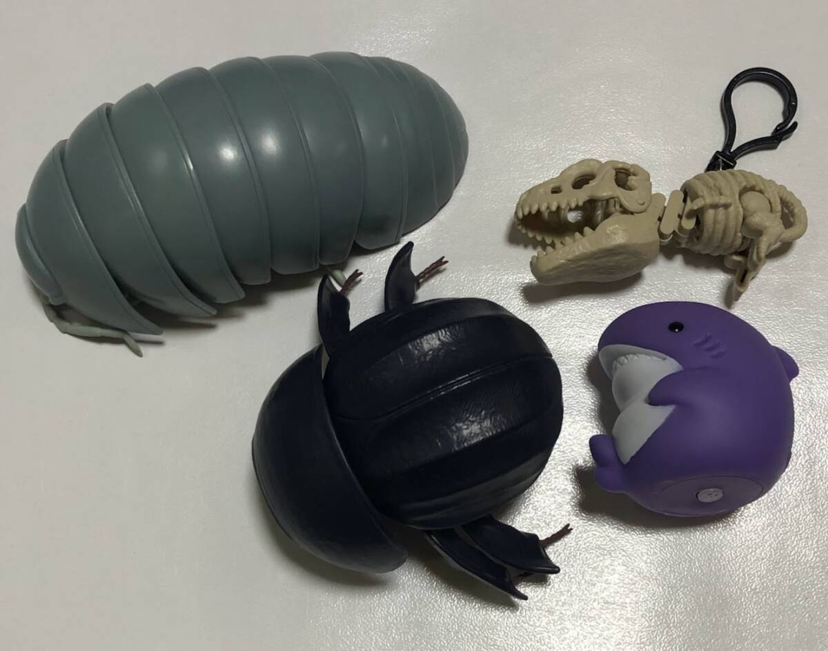 ガチャガチャ ダンゴムシ だんごむし コガネムシ フィギュア & ぷきゅーと!さめ 鮫 ソフビ & 恐竜 骨 キーホルダー