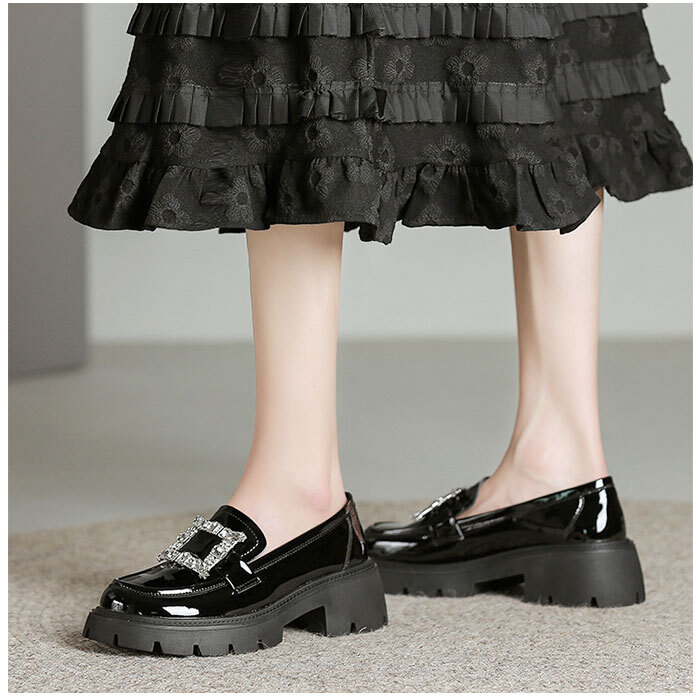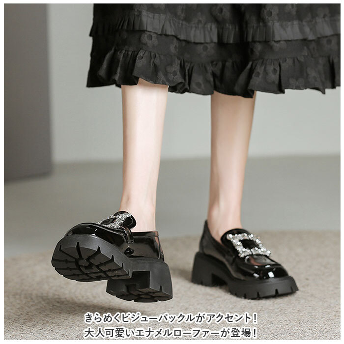 | 商品説明 | ・・きらめくビジューバックルがアクセント!大人可愛いエナメルローファーが登場! ・【エレガントでフェミニンな印象に】 ・光沢のあるエナメル加工に存在感のある大き目のビジューバックルで上品で大人可愛い雰囲気に! ・【スタイルアップ】 ・厚底ソールは履くだけで自然とスタイルアップ! ・【雨の日でも安心】 ・ソールの底面はしっかりと溝が刻まれているので、滑りやすい雨の日でも安心。 ・【こなれ感のあるスタイリングに】 ・合わせやすいシンプルなデザイン&カラー!きれいめコーデの外しアイテムとしてもオススメ♪カジュアルになりすぎず、こなれ感のあるスタイリングを演出! |