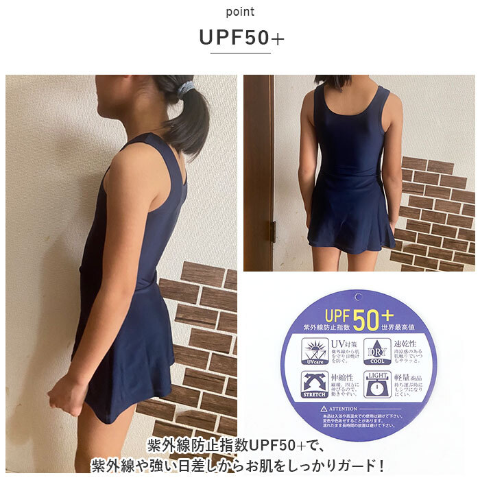 商品説明 | ・・UPF50+で紫外線からお肌をしっかりガード!「スクール水着 チュニックワンピース」が登場。 ・【UPF50+】 ・紫外線防止指数UPF50+で、紫外線や強い日差しからお肌をしっかりガード! ・【速乾性◎】 ・暑い季節に嬉しいサラっとした速乾性のある生地。プールの授業や水遊びも快適に◎ ・【伸縮性あり】 ・どの方向にもよく伸びる、伸縮性に優れた生地。水の中の動きを邪魔せずに、アクティブに動ける! ・【軽量】 ・軽量設計で持ち運びに便利。水濡れした後も重さが気にならないので、通学時もラクラク。 ・【シワになりにくい】 ・シワになりにくい生地感なので、扱いやすい!お手入れが簡単なのも嬉しいポイント◎ ・【チュニックワンピースタイプ】 ・上下一体のチュニックワンピースタイプ。水の中でもめくれ上がる心配なし◎スカートの中は、見えても安心のスパッツ仕様。 ・【快適な着心地】 ・凹凸の少ないフラットな縫い目で肌に優しく快適な着心地。 ・【スクール水着仕様】 ・裏面にネームタグもあり授業やスイミングスクールでも浮かない、シンプルでベーシックなデザイン。 ・【カップつき】 ・140~170cmはカップつきで安心。カップは取り外し可能なので、お洗濯もしやすい。(130cmまでは2重布仕様) ・※他ページにて、型違いやラッシュガードを販売中! |