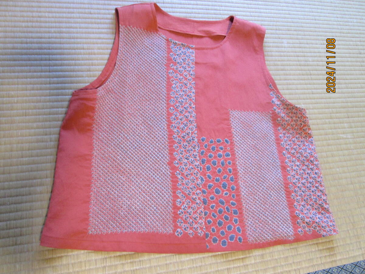 新品未仕立ての正絹絞り模様入りのお着物からふくよかさん用のベストにリメイクしました。