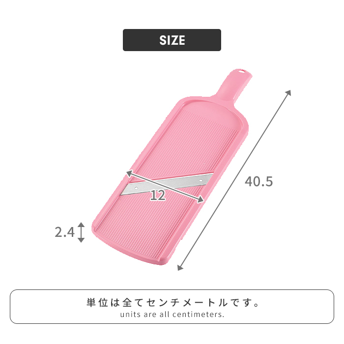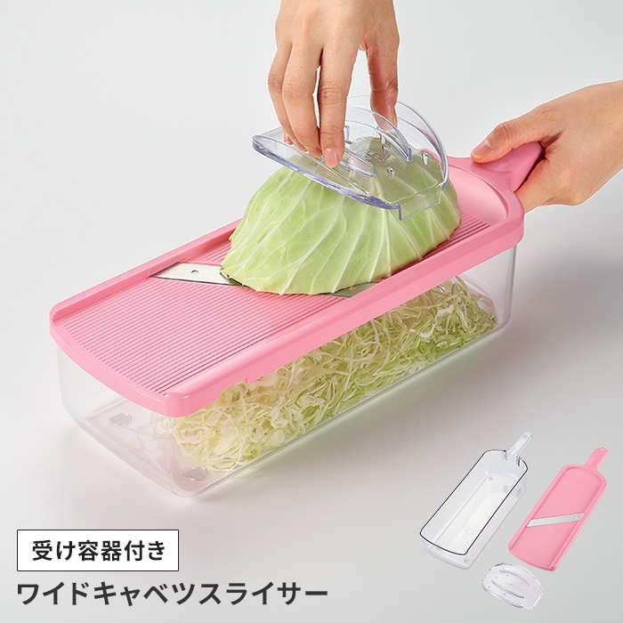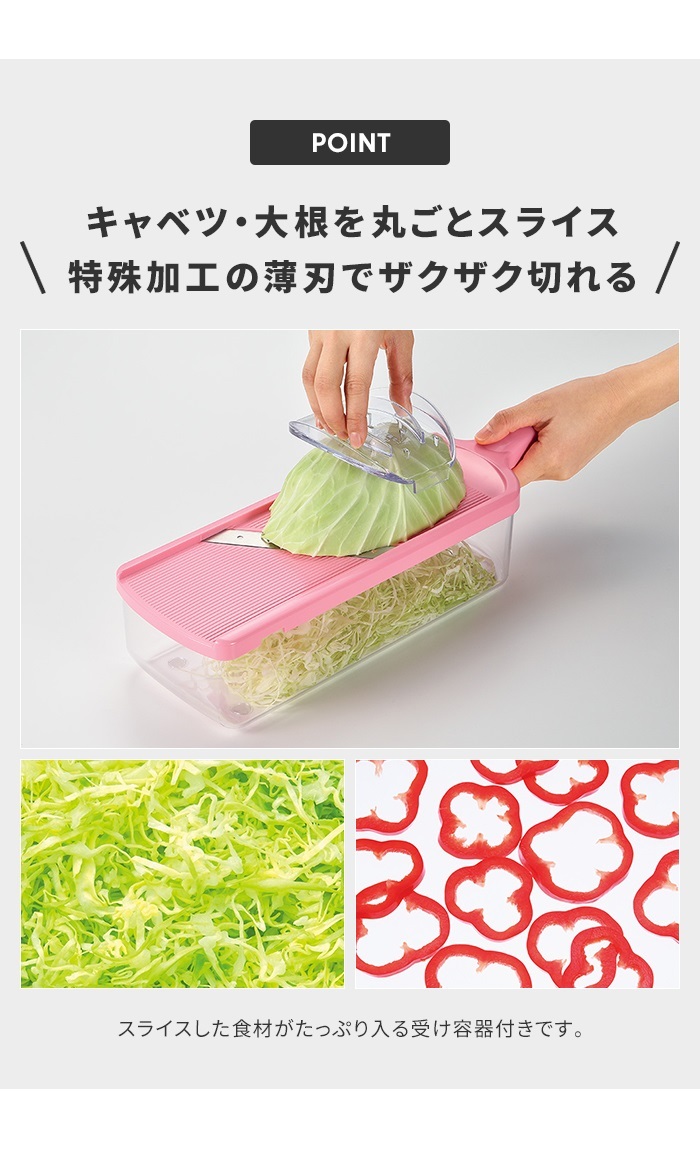 | ・キャベツや大根を丸ごとスライス ・特殊加工の薄刃でザクザク切れます ・スライスした食材がたっぷり入る受け容器付き |