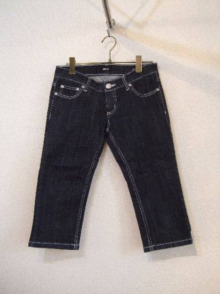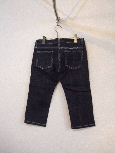 | 商品紹介 | 白いステッチとクリスタル風のボタンがデザインのポイントになった デニムパンツです。 ワンウォッシュ程度のほとんど色落ちの無い濃いブルーで、 7分丈位です。 素材:綿95% ポリウレタン5% |