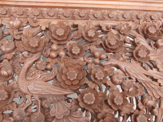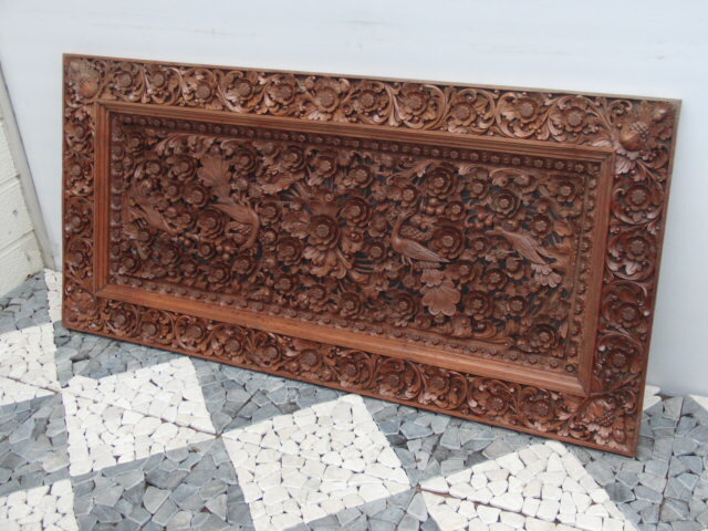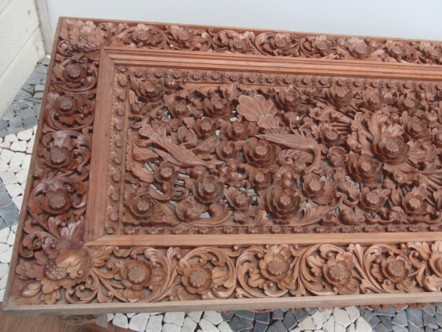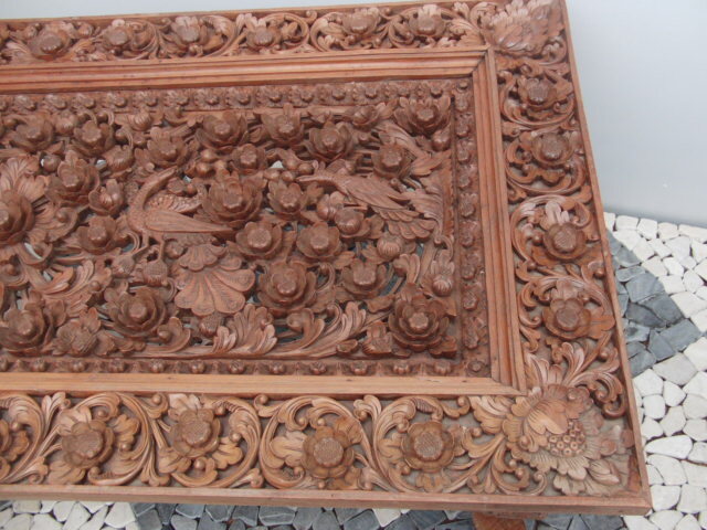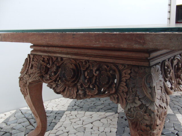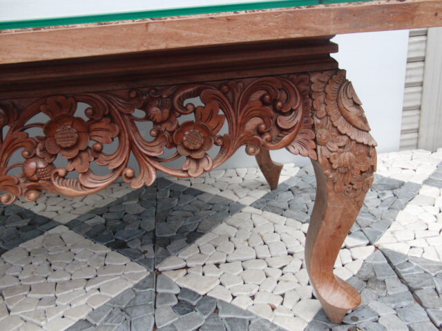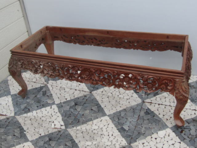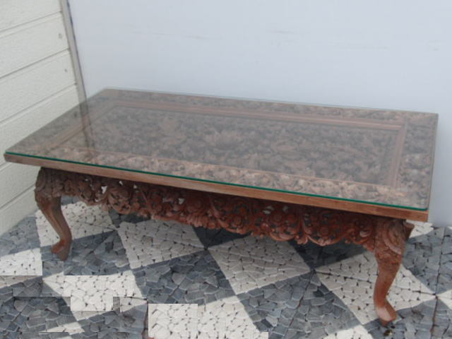 | ◆アジアン無垢材センターテーブル◆木彫花鳥透かし彫ガラストップ 猫足◆USED品 管U-1 | |