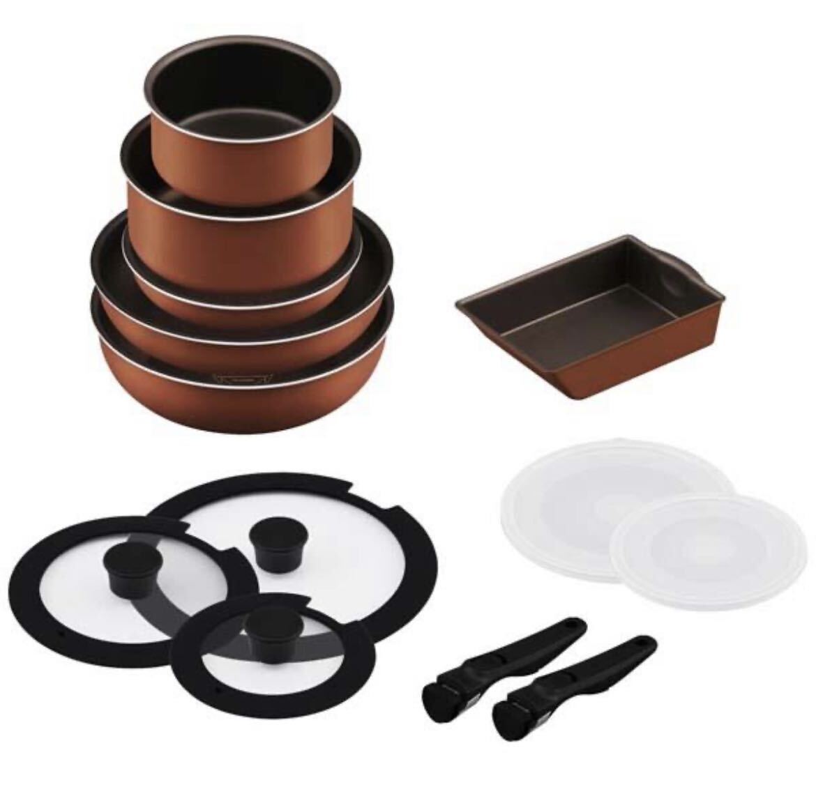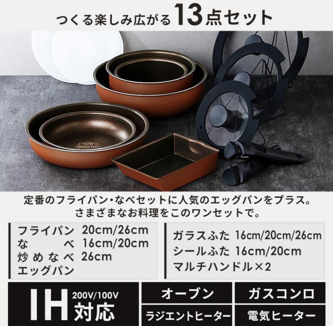 フライパン20cm、フライパン26cm、炒めなべ26cm、なべ16cm、なべ20cm、エッグパン、シリコーン縁ガラスふた16cm、シリコーン縁ガラスふた20cm、シリコーン縁ガラスふた26cm、PEシールふた16cm、PEシールふた20cm、専用マルチハンドル×2