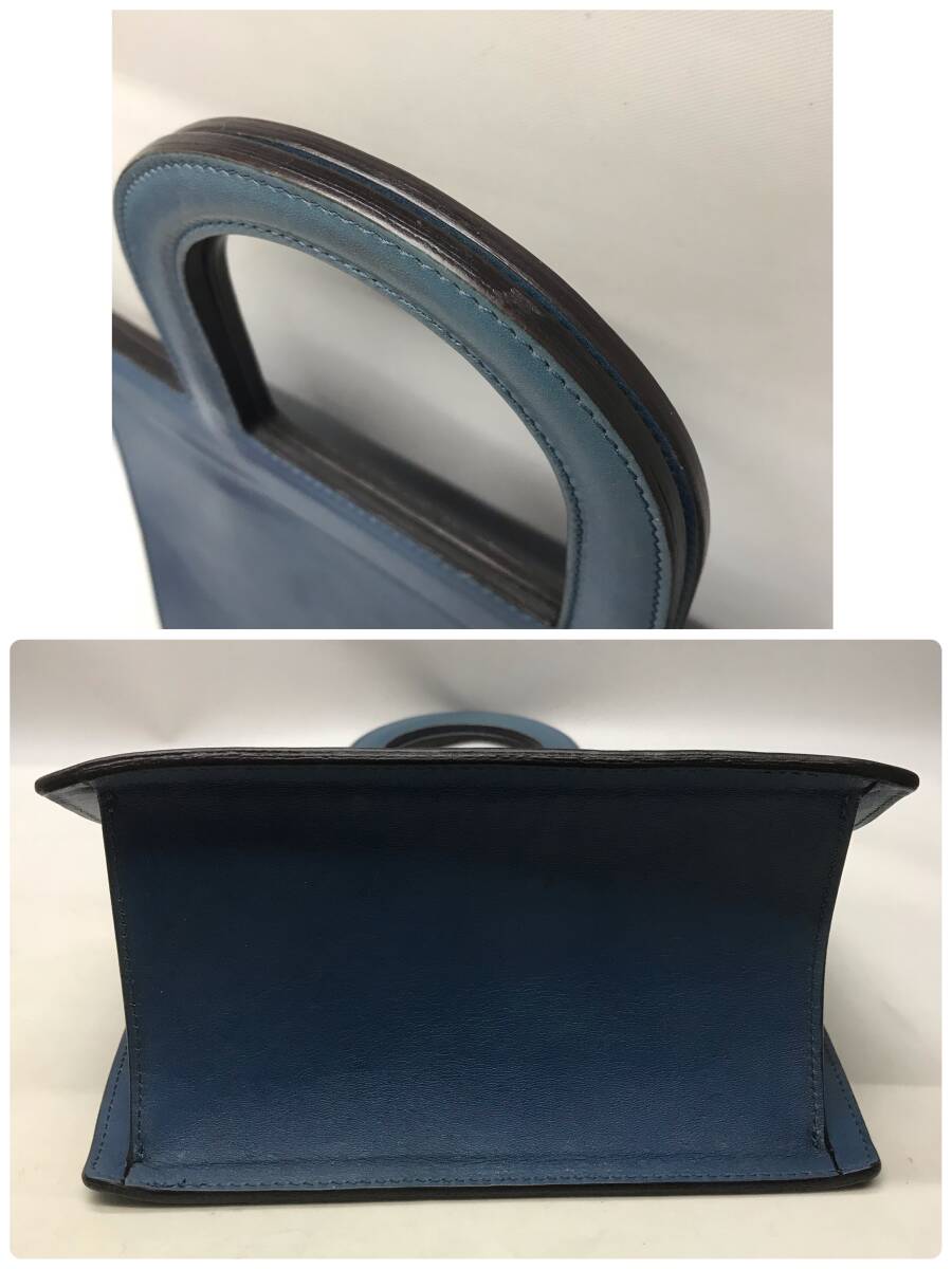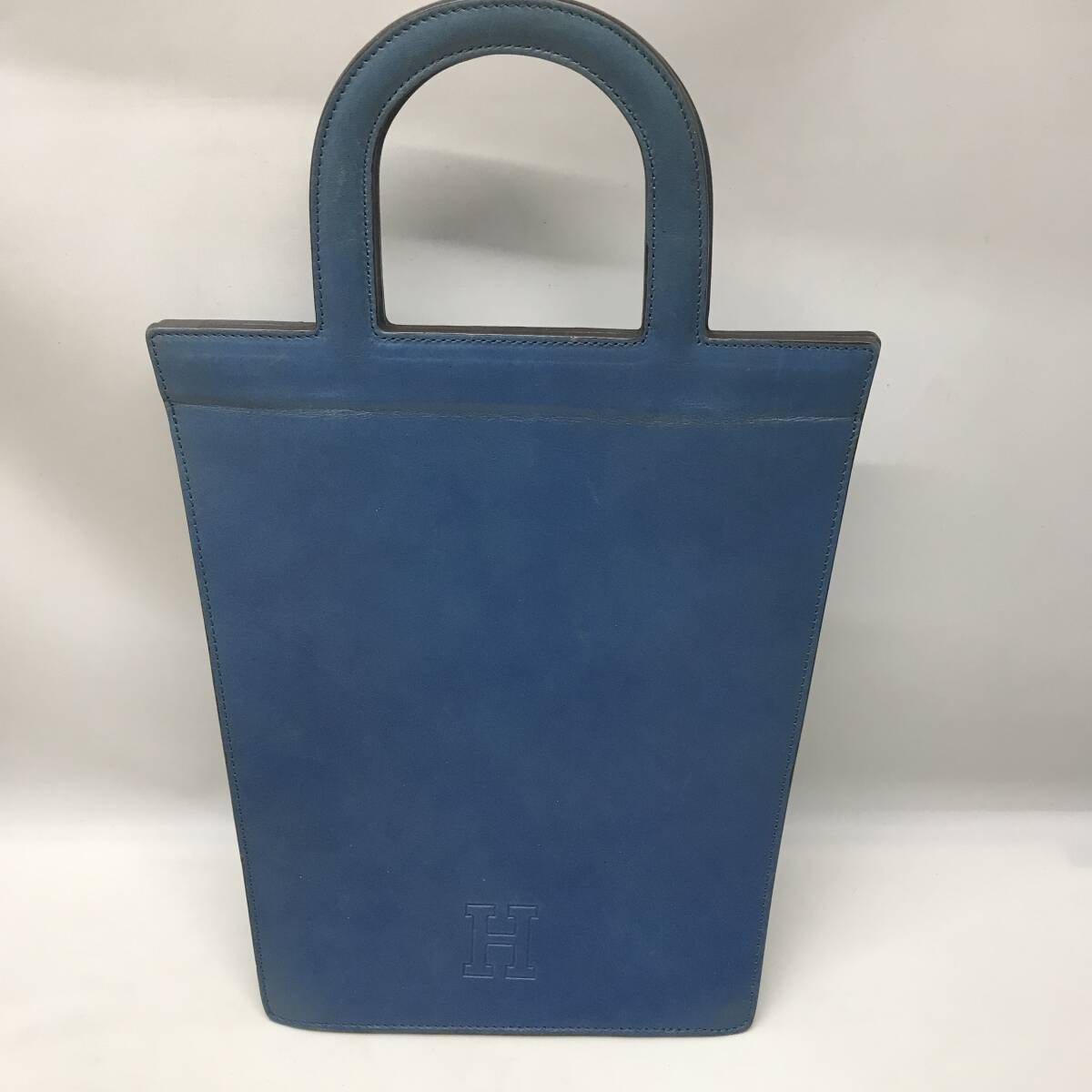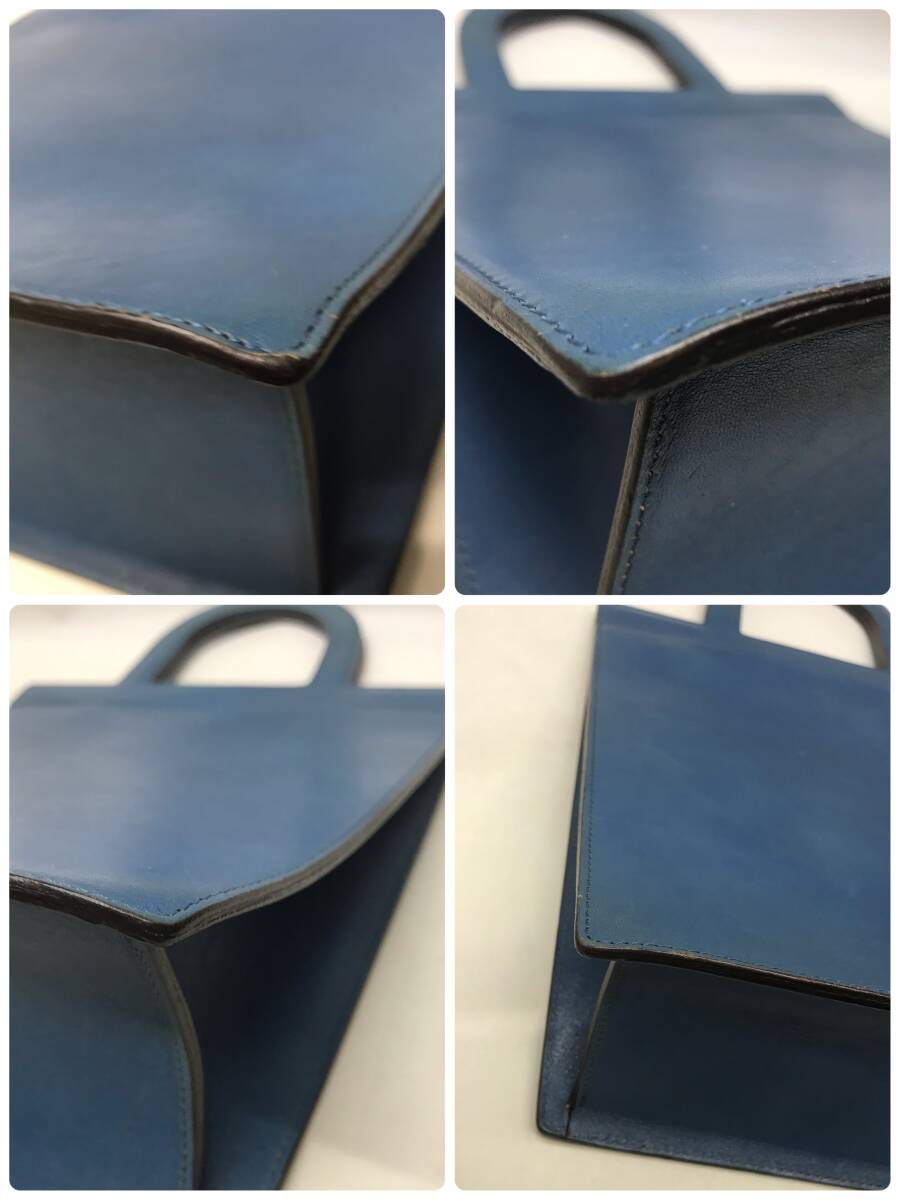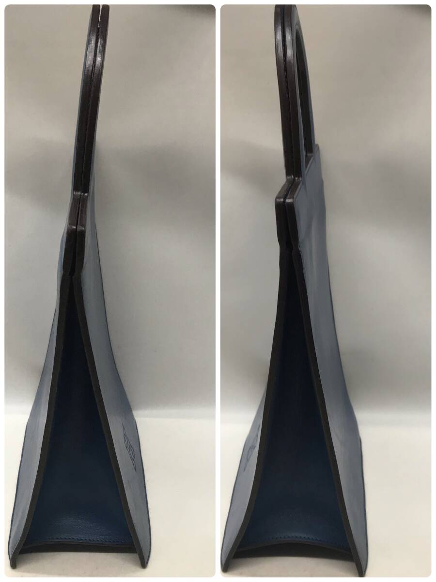 【美品】レア】ヒロフ 三角形 長方形 縦長 ハンドバッグ かっちりレザー 革 青 ブルー トートバッグ