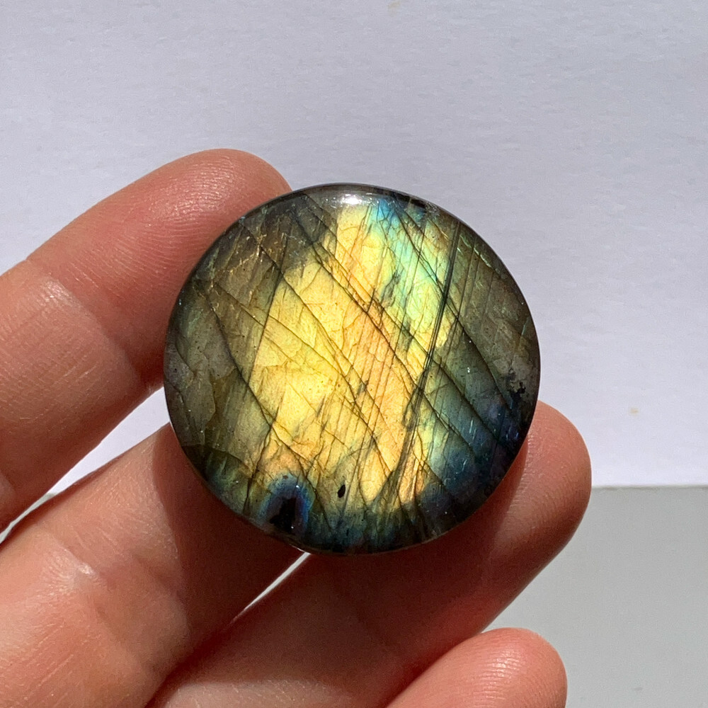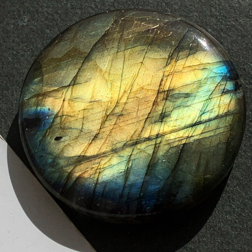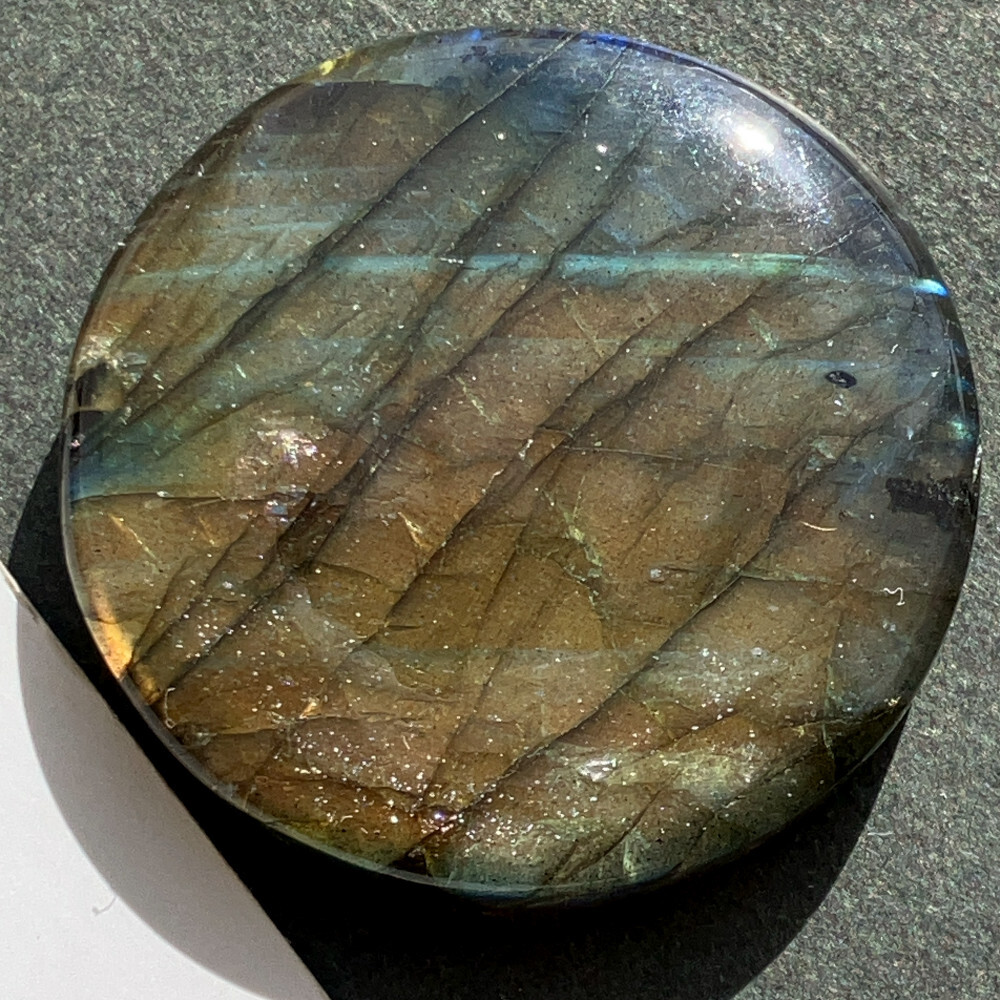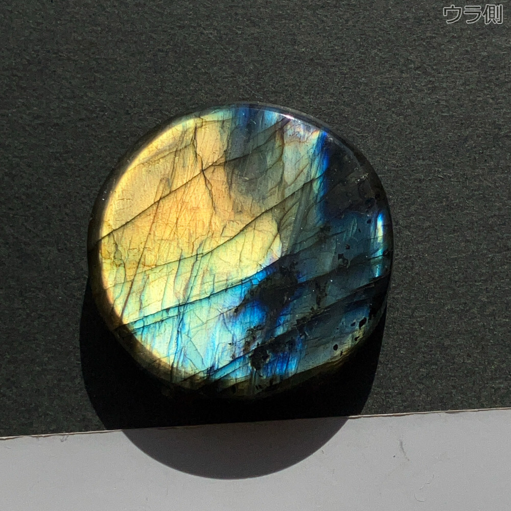 黄昏時の空のような優しい輝きが美しい、ラブラドライトの円形ルースです。