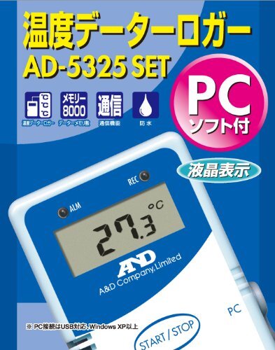 「A&D 温度データーロガー AD-5325SET」▼4981046451055▼(商品説明)本体・ AD5325SET・・Style:本体・表示項目:温度・設定チャンネル数:1チャンネル(内蔵)・測定範囲 温度:-40~+70℃(最小表示0.1℃)・測定精度 温度:±0.6℃(-20~50℃)、±1.2℃(-20~50℃以外の測定範囲)・測定間隔:1秒~12時間、1秒刻みで設定可能説明 ◆簡単に温度を記録し、解析できるデータロガー。◆作業環境や保存環境などの温度の履歴管理に。◆温度を測定、記録、分析が可能。◆低コストで何台でもデータロガーの増設が可能です。◆コンピュータでグラフやデータを表示、さらにテキストファイルとして保存可能です。◆簡単に温度データーを蓄積できます。◆測定時間間隔は1秒から12時間まで、自由に設定可能。◆コンパレータ機能付き。単体で温度異常を知ることが可能。◆データメモリー数は8000メモリー。◆水気に強い防滴構造 IP54相当。◆通信ソフト適合OS:WindowsXP / Vista / 7