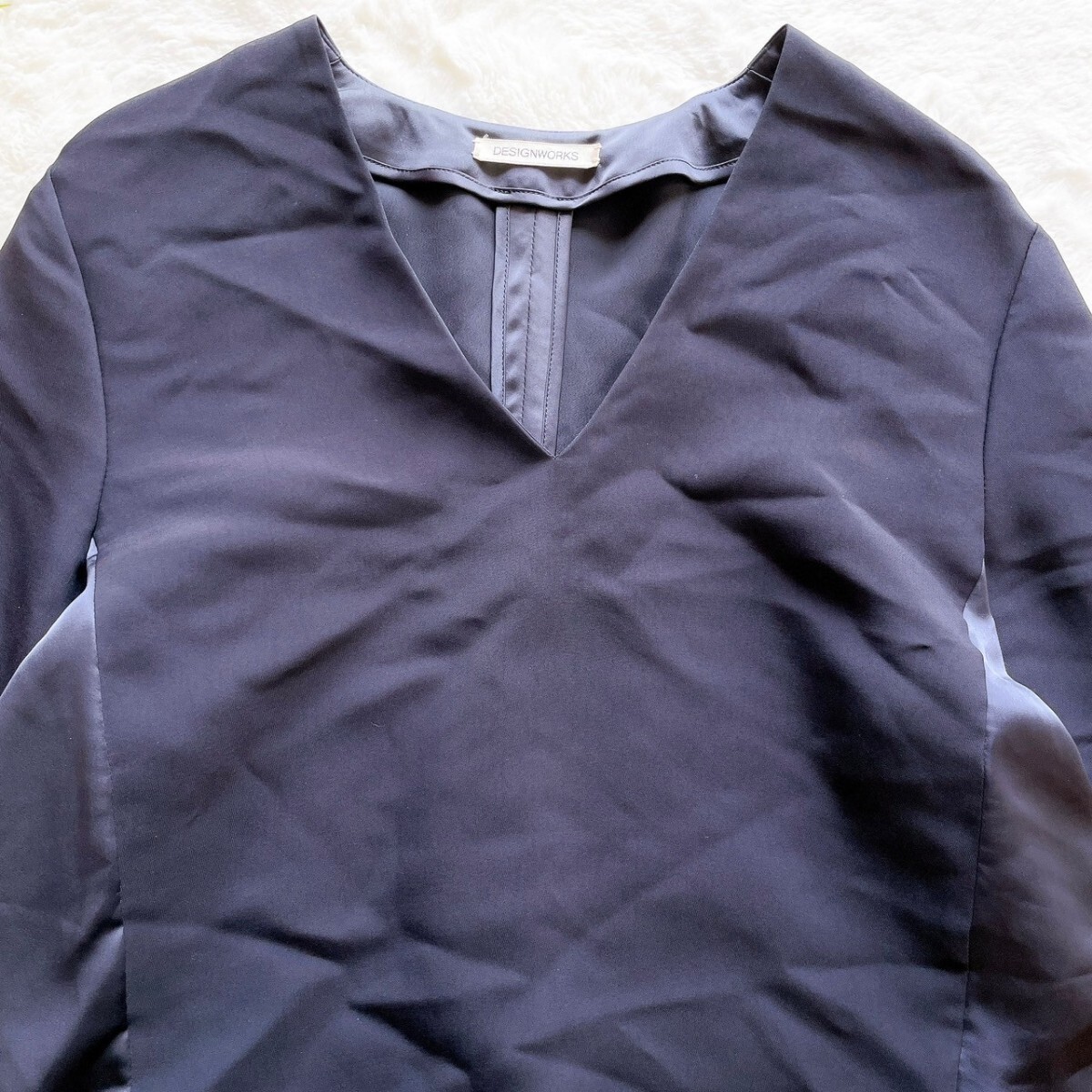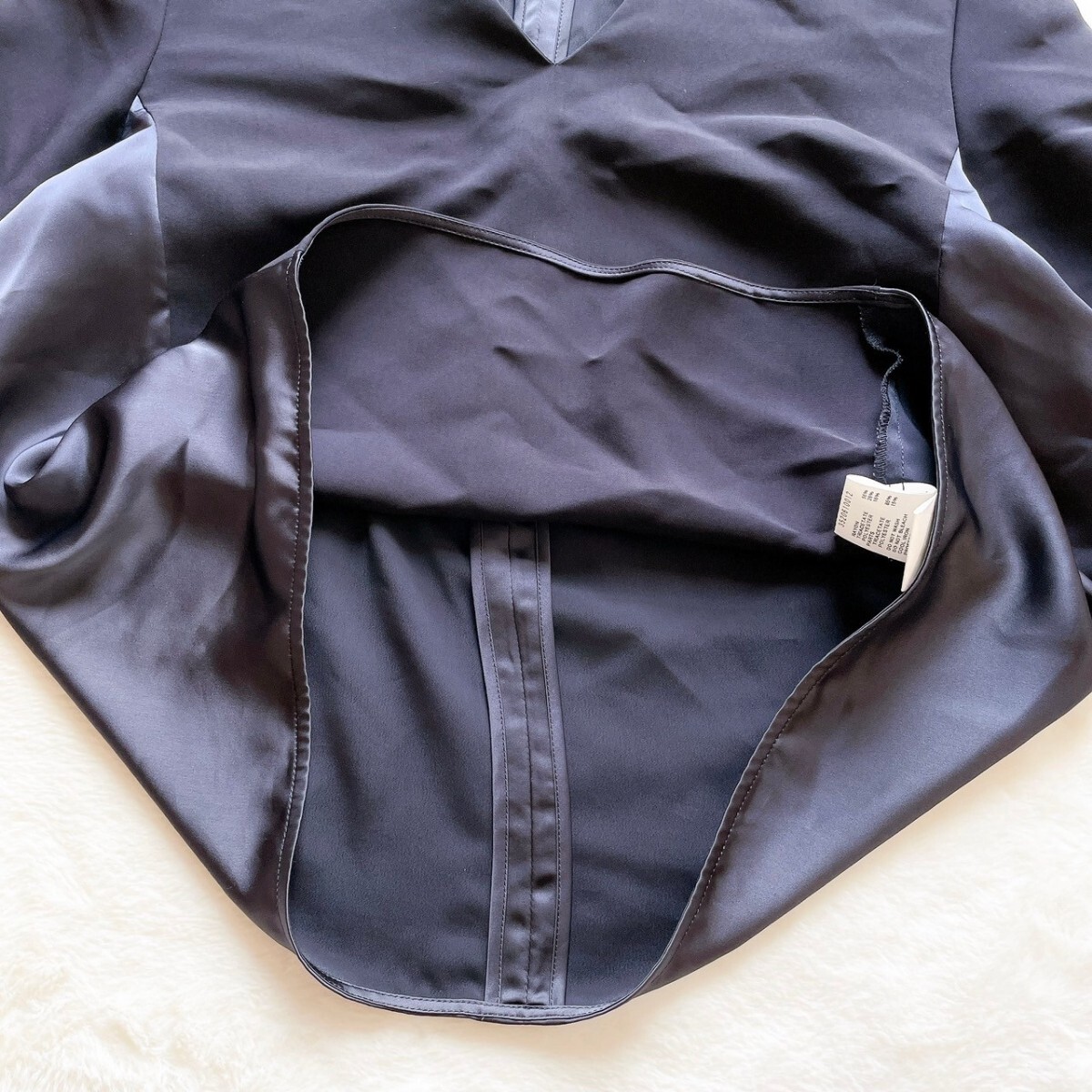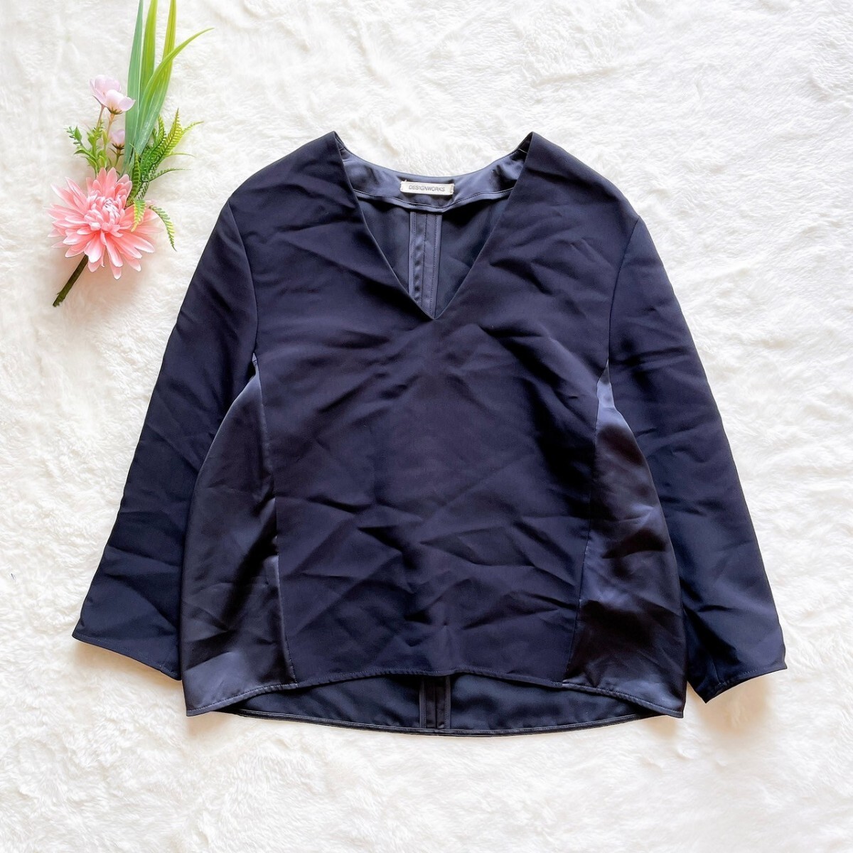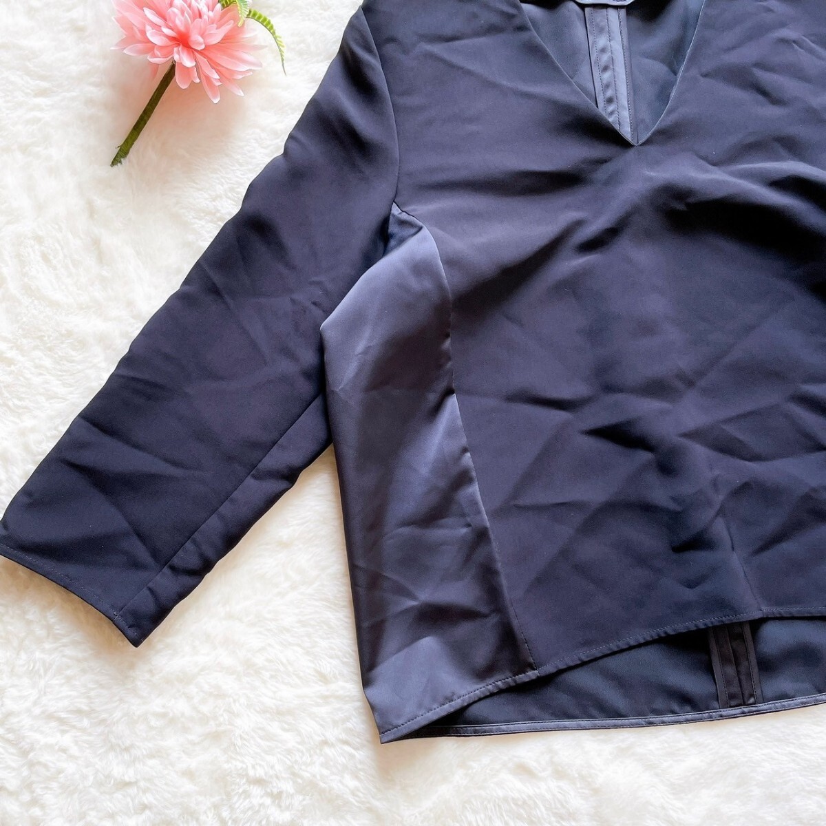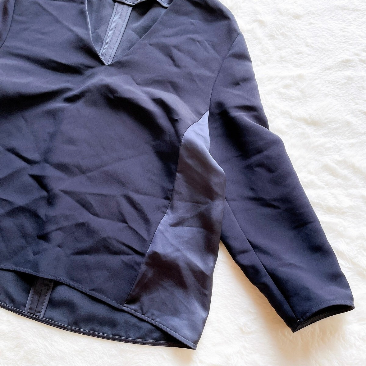 サイドから後ろにかけてサテンをあしらった、異素材コンビのVネックブラウス。