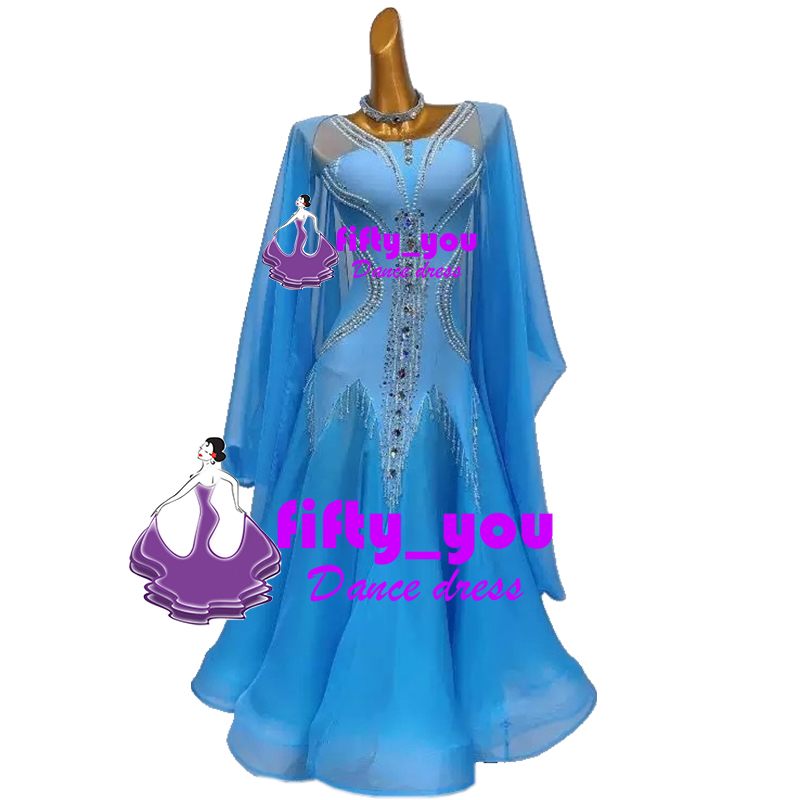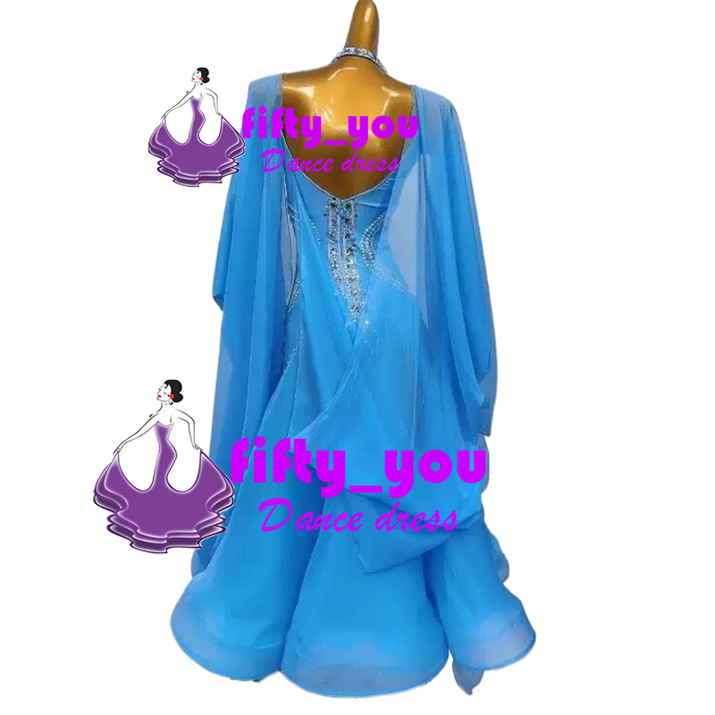 新品fifty_you レディース社交ダンス衣装 セミオーダー モダン競技ドレス スタンダードドレス 素敵水色 ビーズ飾り