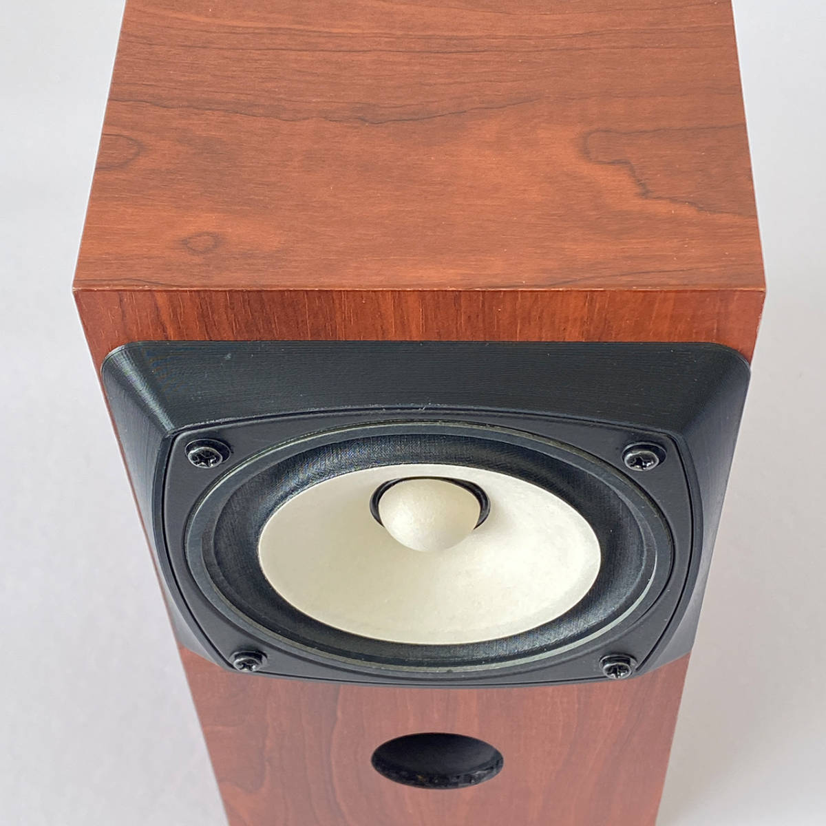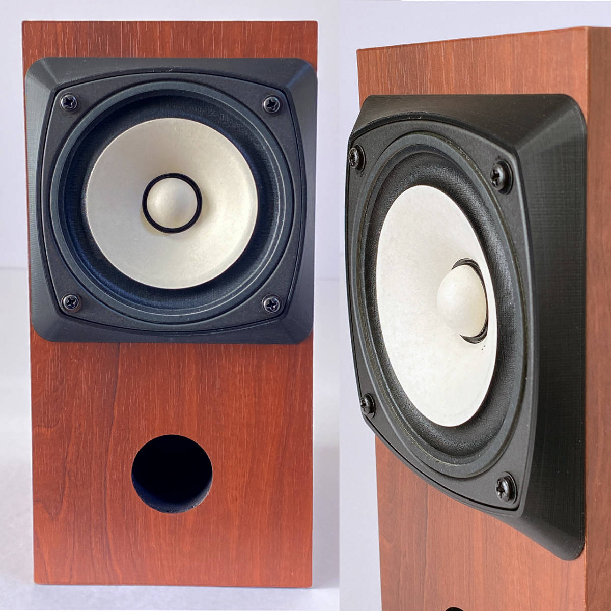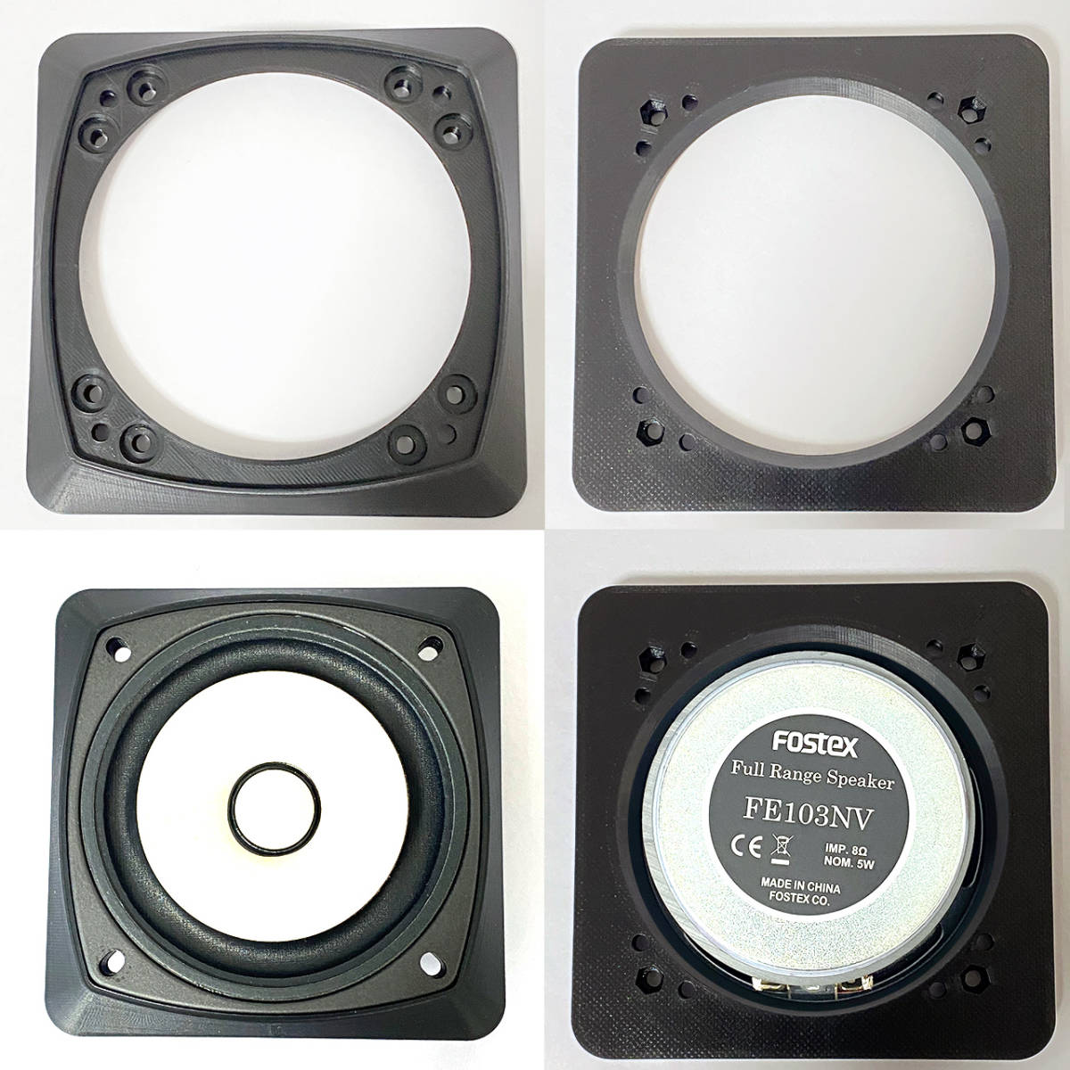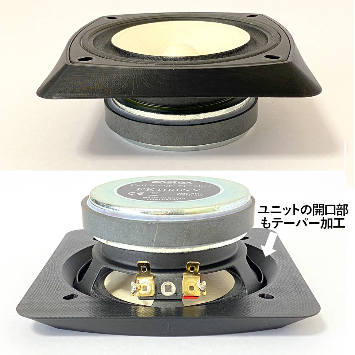 ・Fostexのバックロードホーンエンクロージャー『P1000-BH』に合わせて最適化された形状。 ・最新の『FE103NV』は、『P1000-BH』に取り付けるとマグネットと内部の吸音材が干渉して フレームとバッフル面の間にすき間ができるため、メーカーでは『FE103NV』を取付不可にしています。 しかし、このアダプターを使用すれば、ユニットがバッフル面から1㎝前に出るため 干渉することなく『P1000-BH』に『FE103NV』を取付できます。 ・『P1000-BH』のバッフル面は、側板が僅かに出っ張り、バッフル中央が凹んだ形状になっています。 この凹みの幅(120㎜)に合わせてアダプターを製作したので、バッフル面にピッタリ収まります。 ・3Dプリンターを使用して製作した、オリジナル商品です。素材は、PLA(ポリ乳酸)で非常に硬い材質です。 ・バッフル面の回析が減少し、より点音源に近づき、定位感が向上するなどのメリットがあります。 ・FE103シリーズのフレーム形状に合わせたザグリがある為、アダプターとユニットが面一で装着できます。 |