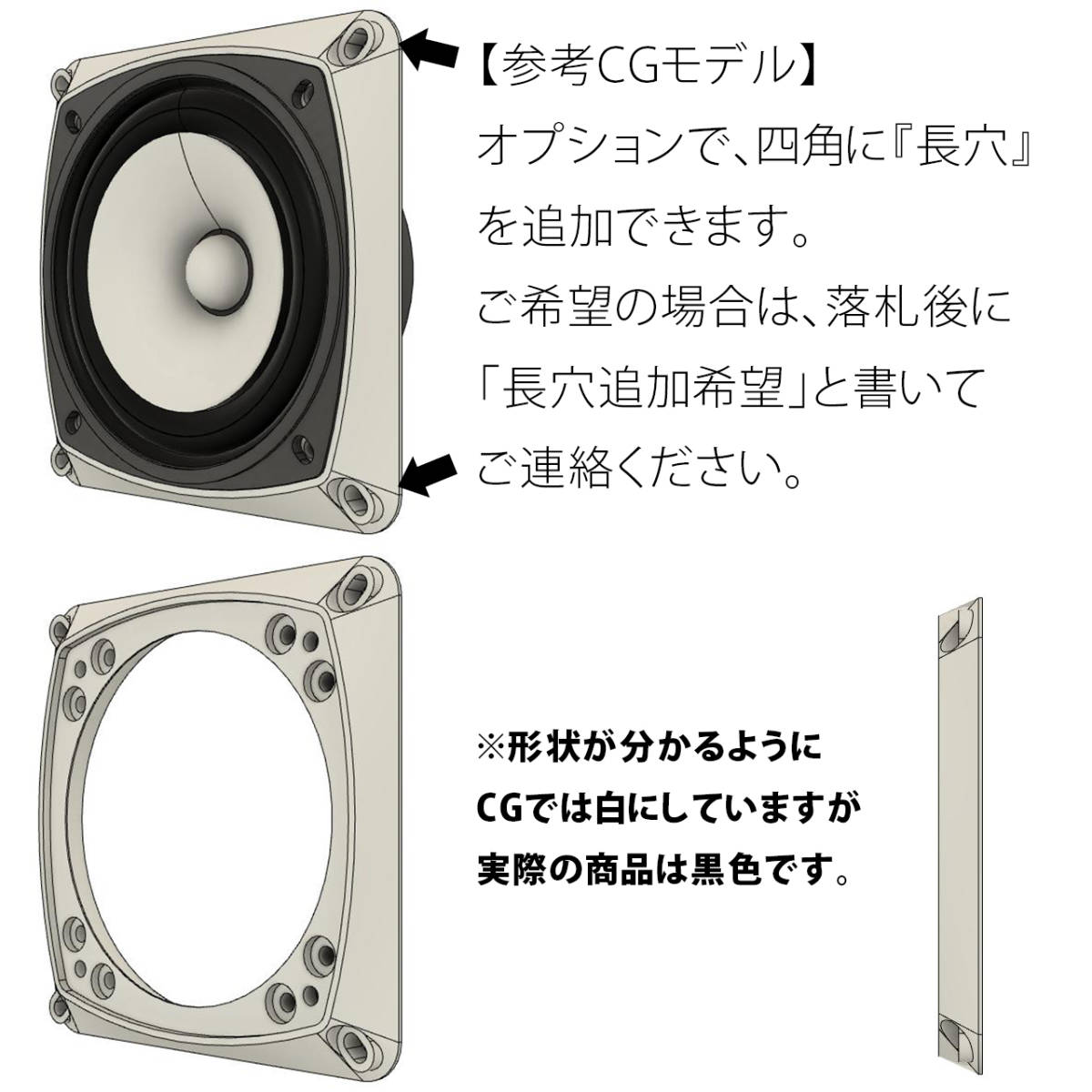 ・外形サイズ:120㎜×120㎜/ 厚さ:11㎜ ・ユニット開口部φ103㎜ ・ユニット取付ネジピッチサークルφ115㎜ ・ユニット取付ネジ数-サイズ4-4.2 ・バッフル取付ネジ穴:ピッチサークルφ107㎜ ・バッフル取付ネジ穴数-サイズ:8-3.2 ※製品画像は、M4サイズですが、実際の商品のバッフル取付ネジ穴はM3になります。 ・オプション長穴:ピッチサークルφ145㎜ ・オプション長穴:数-サイズ4-4.5×7.5長穴 【付属物】 ・本体2個 ・M3木ネジ=8個 ※同梱するバッフル取付用の木ネジは、片チャンネル4個の計8個です。 ・M4ボルト=8個 ・M4ナット=8個 |